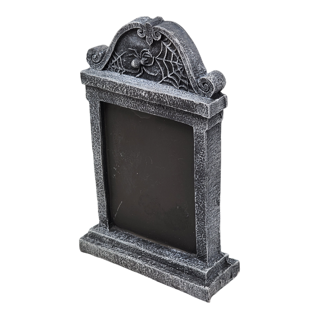 Elevate your Halloween decor with this spine-tingling chalkboard tombstone! Standing at 8 inches tall and 5 inches wide this creatively designed piece features a spooky skull atop an ornate engraved frame perfect for setting a creepy yet fun vibe at your festivities. The textured resin surface gives it an authentic graveyard feel making it a standout addition to your haunted house setup or outdoor display.