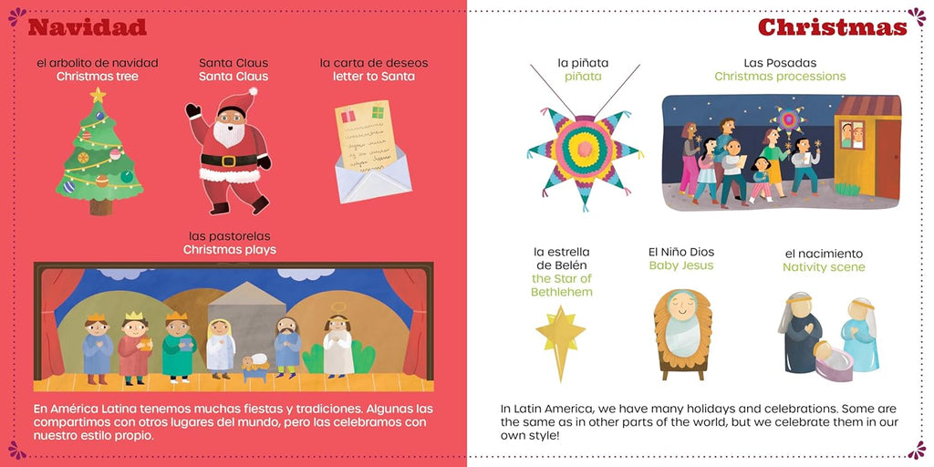 Tons of Palabras: Fiestas is the third title in the series, presenting kids with traditions and special occasions that are celebrated in Hispanic and non-Hispanic households. The book covers holidays like Christmas, Day of the Dead, and Holy Week, discussing the customs around these special times as well as the delicious foods that accompany them! Did you know that on New Year's, it's a tradition in some Latin American countries to eat 12 grapes at the stroke of midnight? Or that during Day of the Dead, funny verses are read in honor of loved ones who are no longer with us? Birthdays are also an exciting time, with piñatas, cake, and games. Tons of Palabras: Fiestas is full of fun, colorful, and interesting Latin American celebrations!