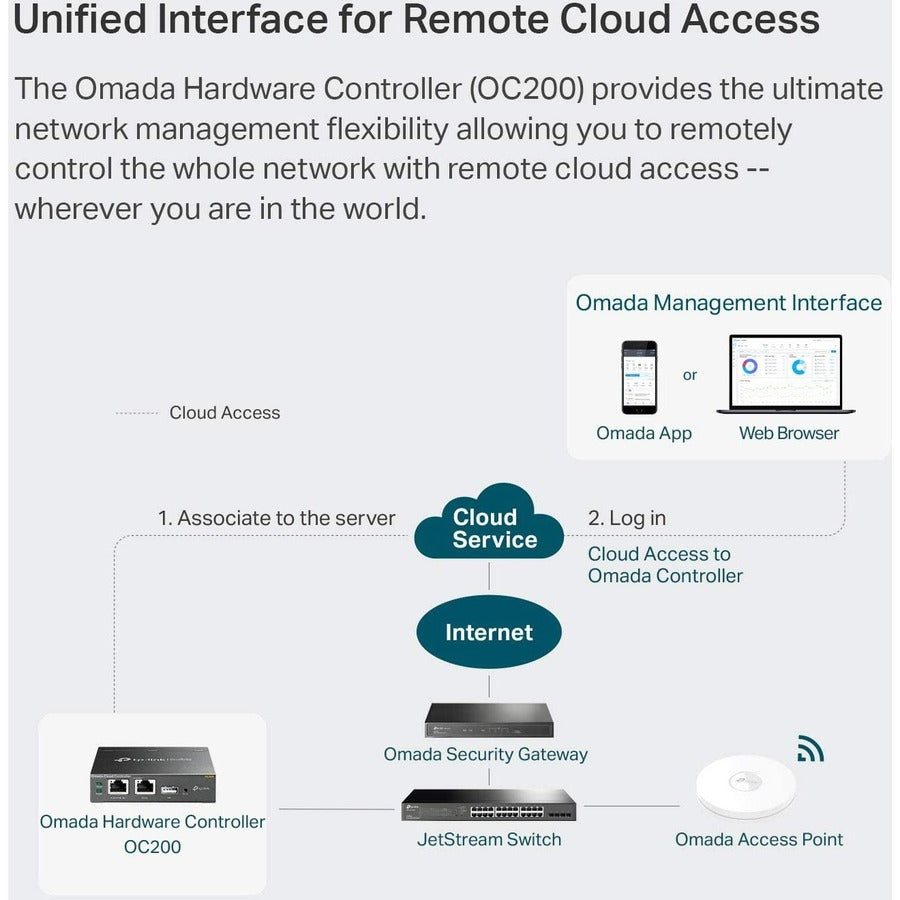 - Cloud Access with No License Fee: Enjoy cloud service with no license fee with the use of OC200. Remote Cloud access and Omada app brings centralized cloud management of the whole network from different sites-all controlled from a single interface anywhere, anytime.