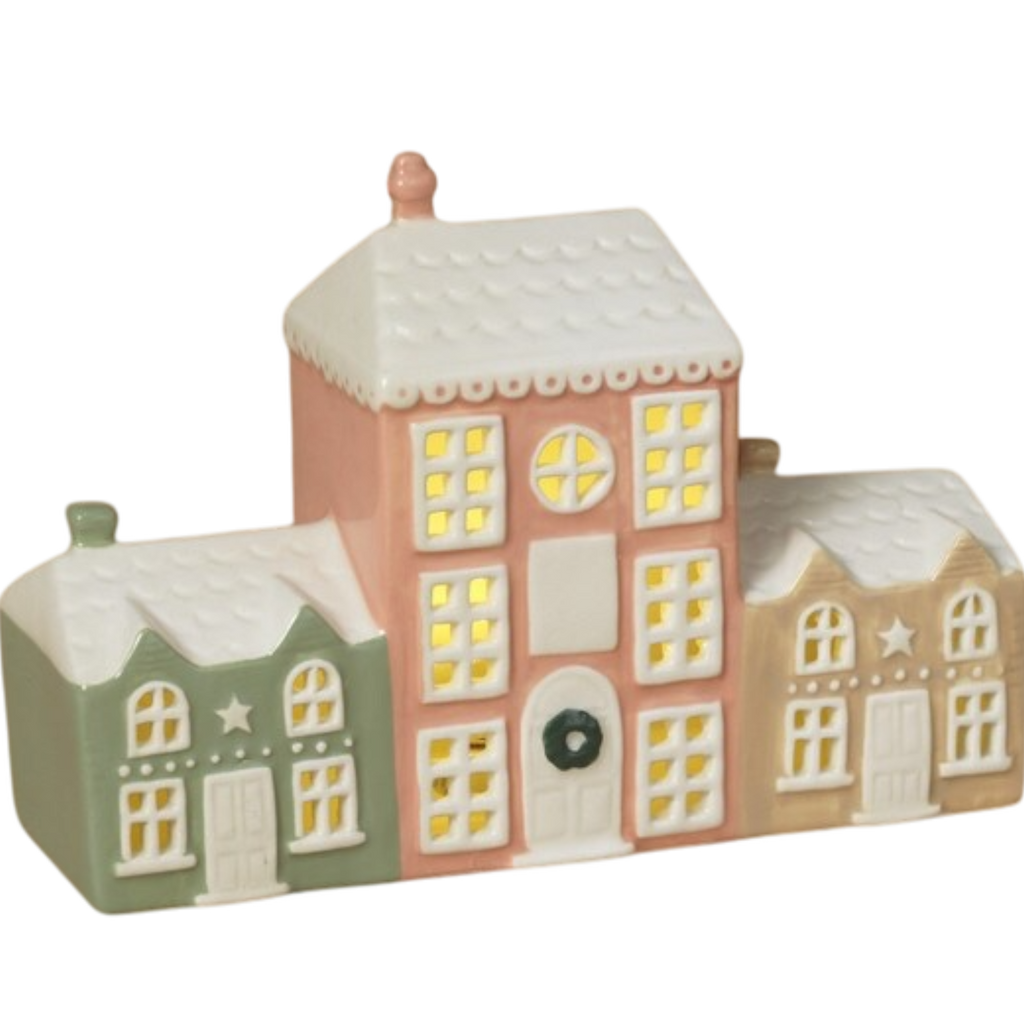 Add a touch of classic elegance to your holiday décor with our Traditional Light-Up Ceramic House! Standing at 5.5 inches tall and 8 inches wide, this beautifully crafted piece features a charming design that showcases a trio of homes in soft pastel colors of pink and green. The intricate detailing and traditional architecture embody the warmth and nostalgia of classic colonial style, making it a timeless addition to your festive decor.