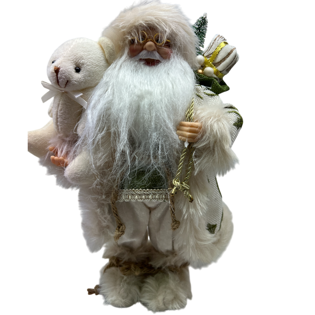 Santa with Bear: This charming Santa features a soft cream robe and holds a cuddly bear, perfect for evoking childhood memories of holiday magic. With his gentle demeanor and festive details, he radiates warmth and cheer, making him a wonderful addition to your Christmas decor.