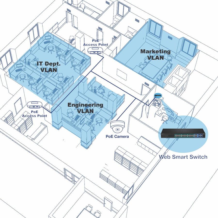 A: The web smart interface provides intuitive network monitoring, VLAN configuration, and traffic management — perfect for enterprise networking applications requiring centralized control.