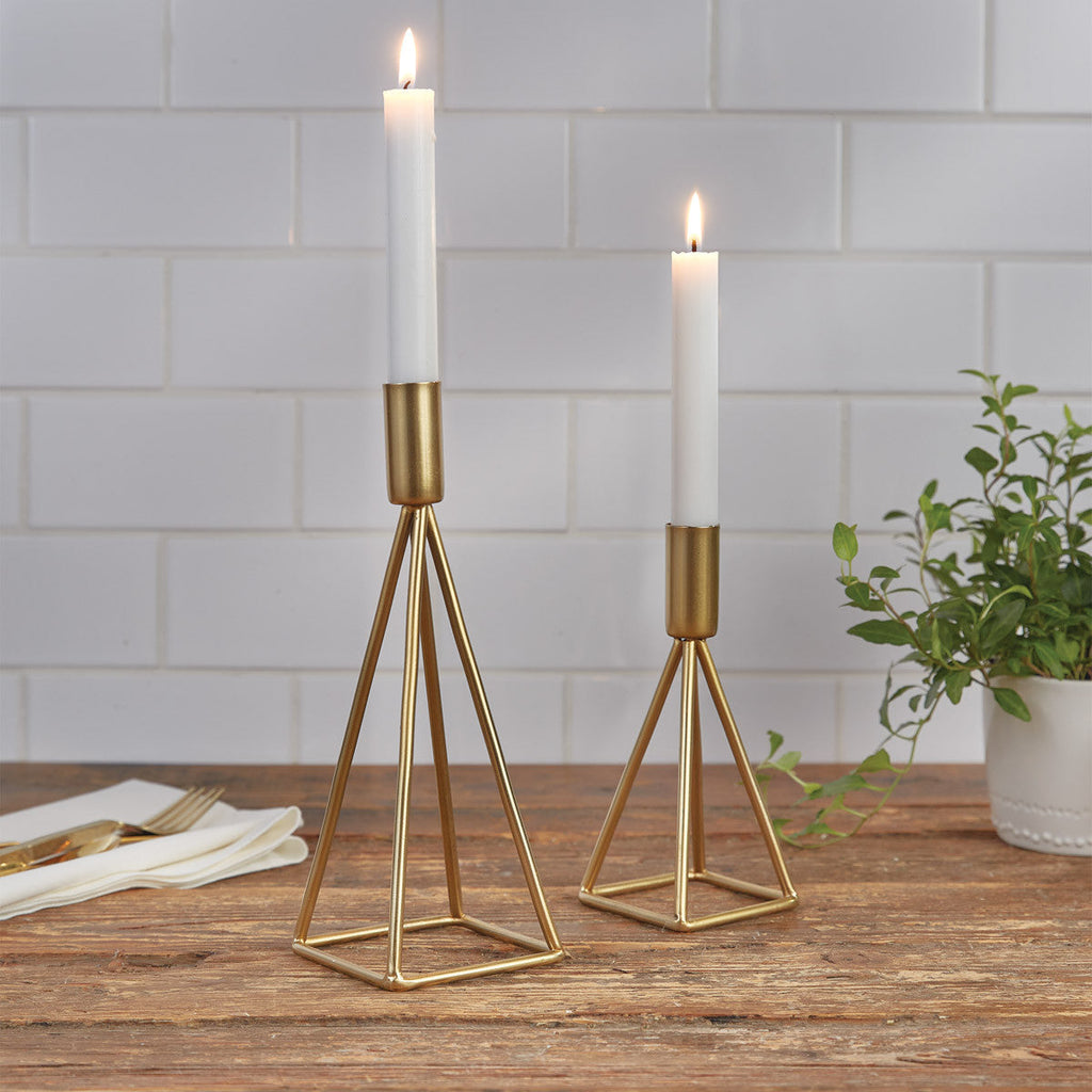 Illuminate your space with a touch of elegance! This Gold Triangle Taper Candle Holder is the perfect blend of modern design and timeless sophistication. Whether you're setting the mood for a cozy dinner or adding a chic accent to your living room, this stunning piece effortlessly elevates any decor. Crafted with precision and style in mind, it's not just a candle holder—it's a statement