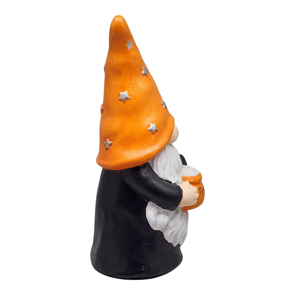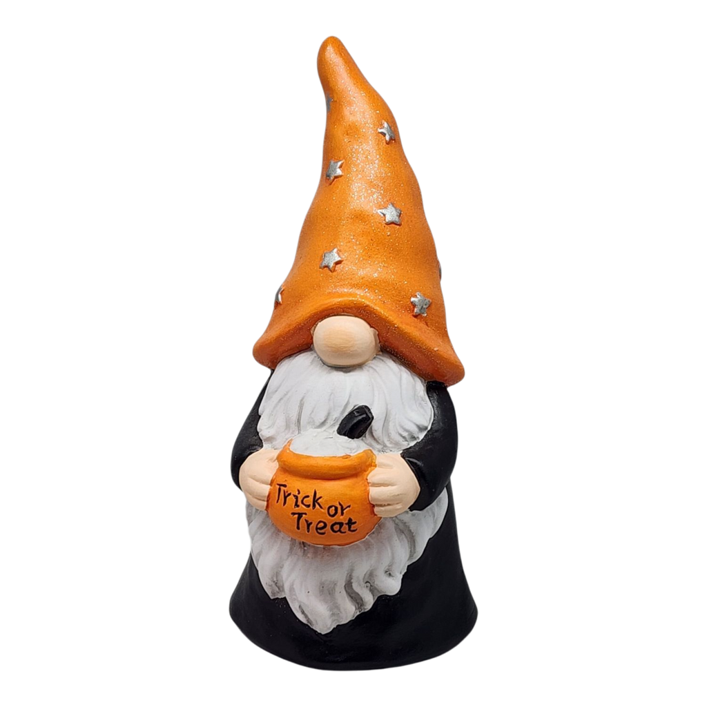 Get ready to cast a spell of charm in your Halloween decor with the delightful Halloween Gnome Figurine! Standing at 10 inches tall, this whimsical terracotta gnome features a playful design, complete with an iconic orange pointed hat adorned with stars and a big, friendly beard. Clutching a jack-o'-lantern bucket that reads "Trick or Treat," this adorable gnome is perfect for spreading festive cheer throughout your home during the spookiest time of the year.