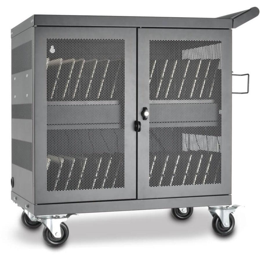 ● Fast 2.4A USB charging and syncing for 32 tablets ● Secures devices in locking, vented, wall-mountable steel cart ● Protective shelves with removable dividers and cord management ● Wide-grip handle and locking casters with non-marking wheels ● Ships ready for quick, easy installation