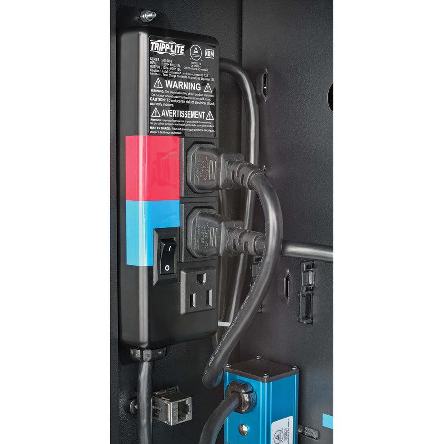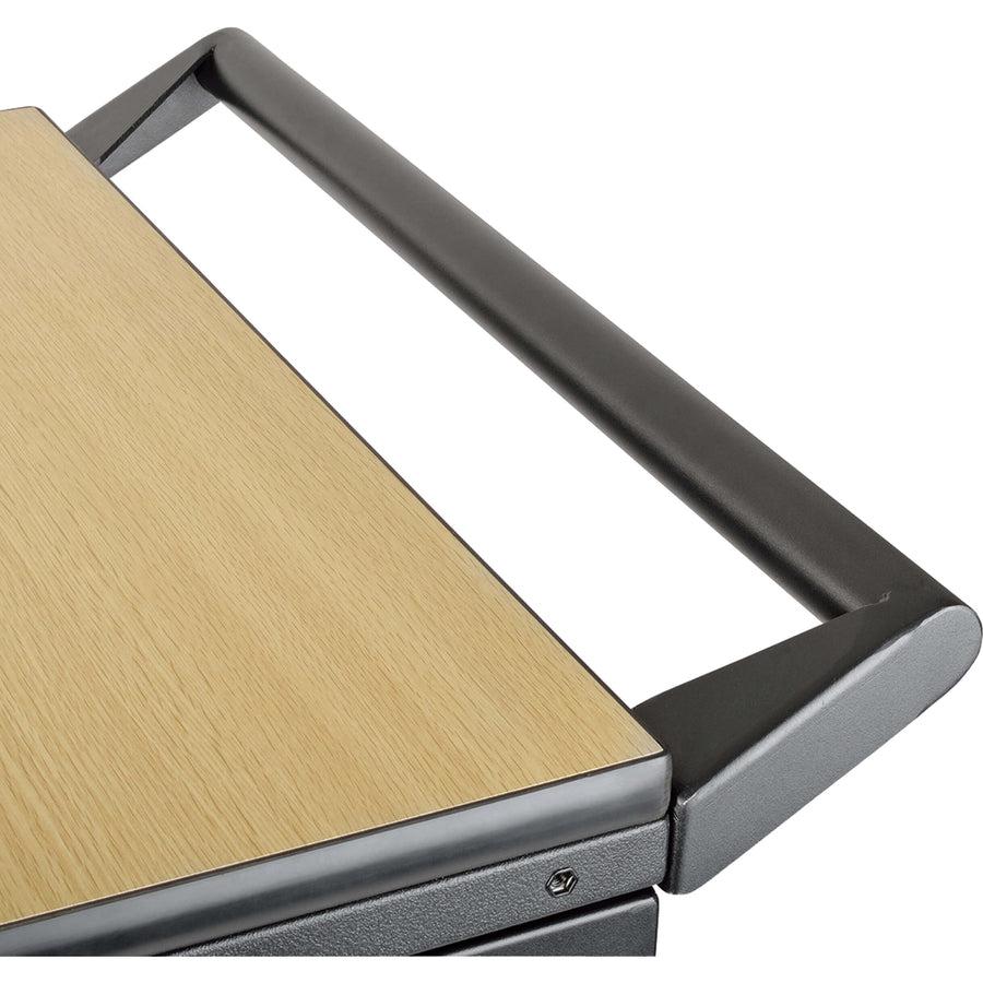 Laminated Wood-Grain Top Doubles as a Convenient Workstation The laminated top acts as a smooth writing surface and holds a projector, monitor or other peripherals that plug into two external NEMA 5-15R outlets controlled by an inside on/off switch. A pass-through RJ45 jack is provided for connecting Ethernet devices, such as a wireless router or hotspot, inside the cabinet.