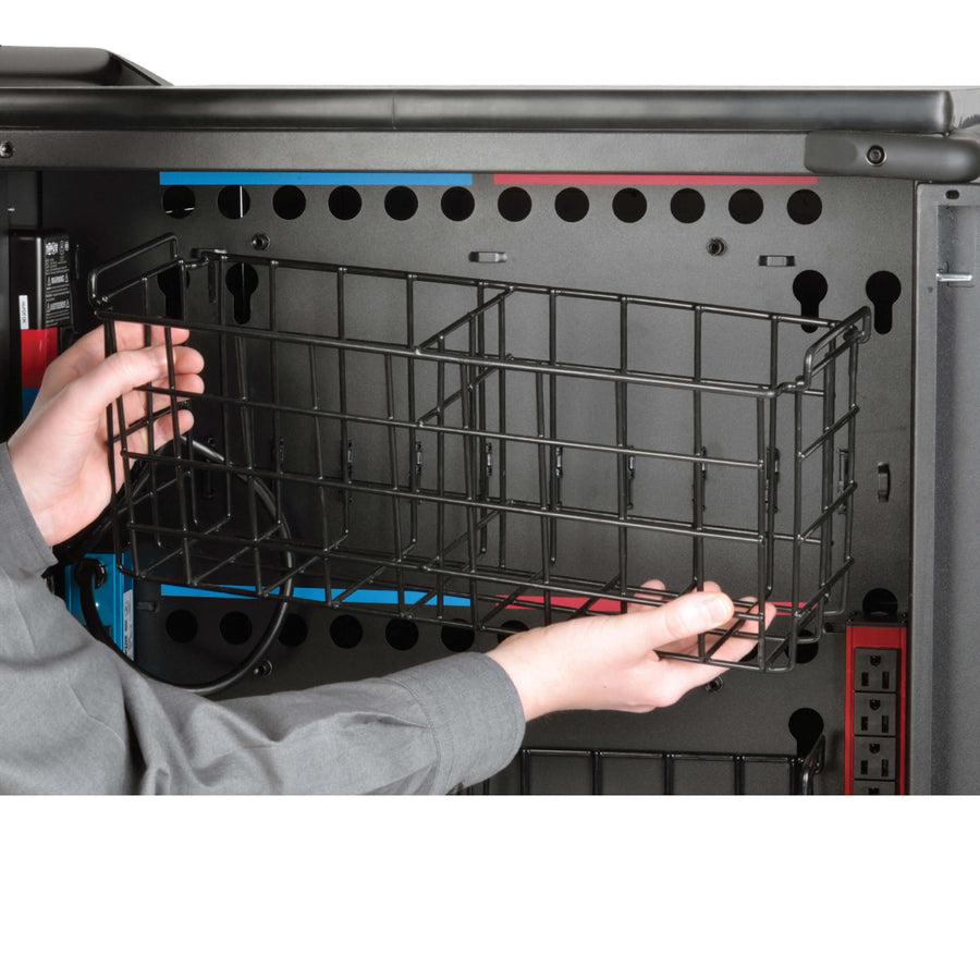 Well-Organized to Avoid Confusing Cable Clutter Heavy power adapters store out of the way in removable baskets. Cables and connectors run through zoned slots and an overhead cable manager, keeping them organized and out of the way. Adjustable dividers accommodate up to 16 devices per shelf, and device spaces are numbered for easy identification. A power cord wrap keeps the input cord out of the way when moving the charging station. The 10-foot cord with space-saving right-angle NEMA 5-15P plug allows great flexibility in reaching AC outlets.