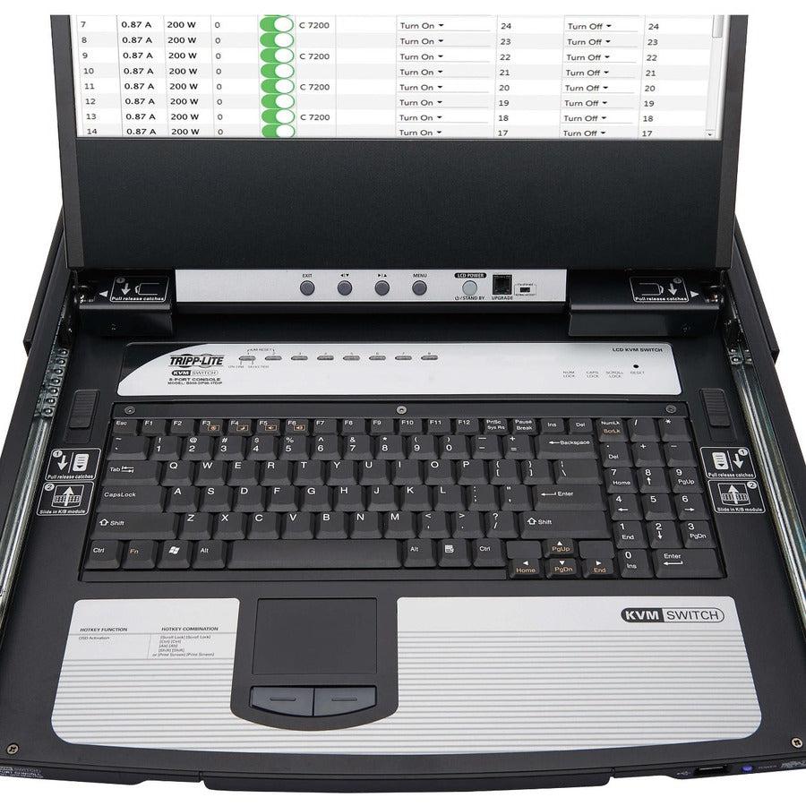 Tripp Lite B030-DP08-17DIP. Keyboard port type: USB, Mouse port type: USB, Video port type: DisplayPort. HD type: Full HD, Maximum resolution: 1920 x 1080 pixels, Auto scan delay (min): 1 s. Product colour: Black, Rack capacity: 1U, Housing material: Metal. Display: LCD, Display diagonal: 43.2 cm (17"). Power source: AC, AC input voltage: 100 - 240 V, AC input frequency: 50/60 Hz