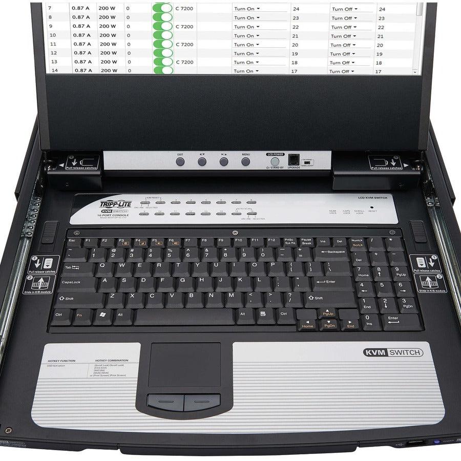 Tripp Lite B030-DP16-17D. Keyboard port type: USB, Mouse port type: USB, Video port type: DisplayPort. HD type: Full HD, Maximum resolution: 1920 x 1080 pixels. Product colour: Black, Rack capacity: 1U, Housing material: Metal. Display: LCD, Display diagonal: 43.2 cm (17"). Power source: AC, AC input voltage: 100 - 240 V, AC input frequency: 50/60 Hz