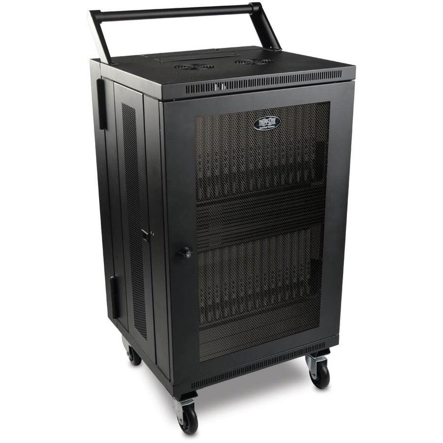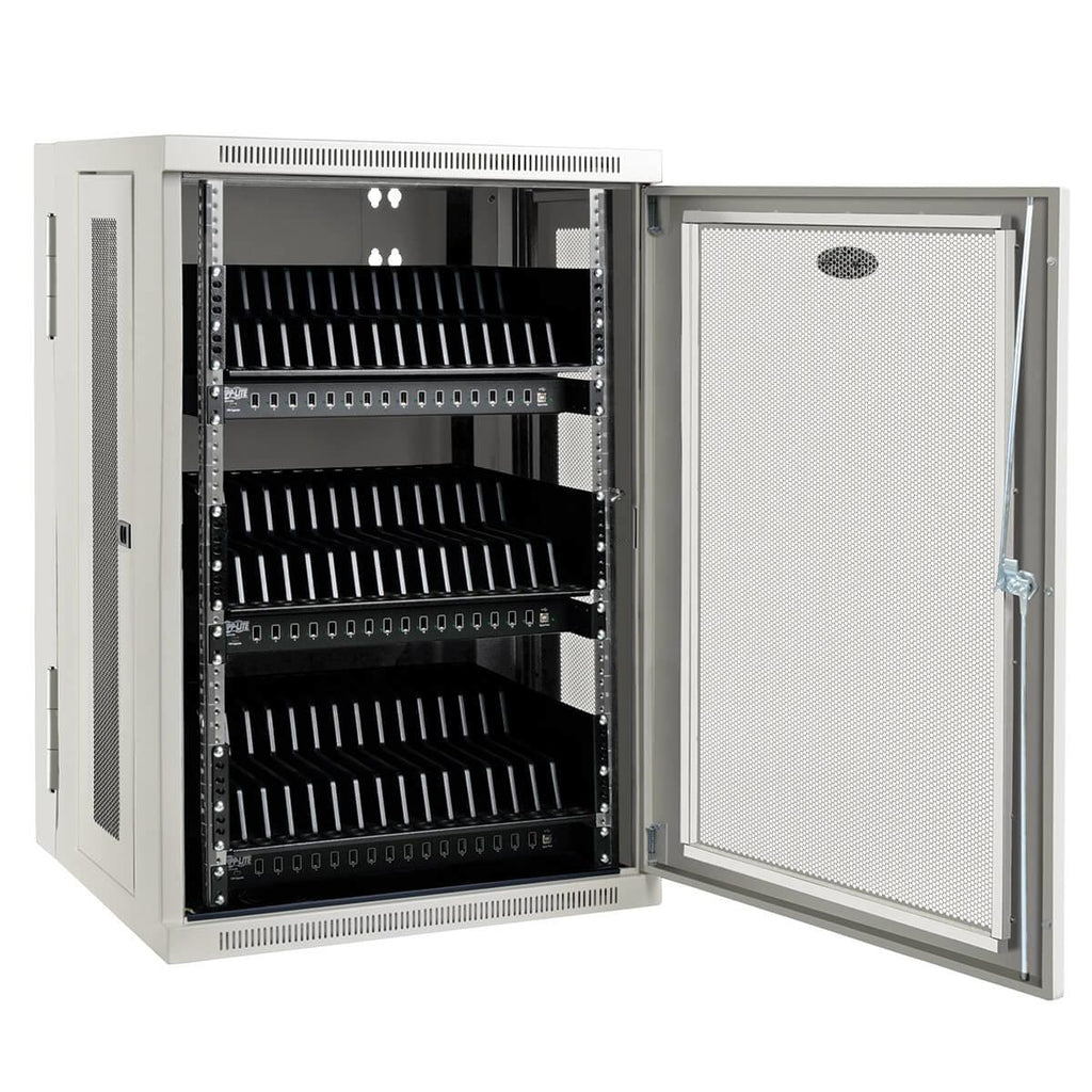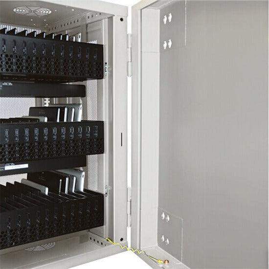 Comprehensive Protection Sturdy steel construction and powder-coated finish promote long-term durability Doors lock with included keys to help prevent device theft, damage or tampering Flow-through ventilation helps prevent devices from overheating Coated shelves shield devices from scratches and scuffs