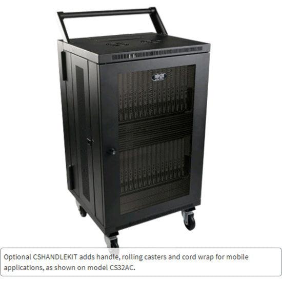 Flexible Configuration Ships fully assembled Supports mounting to wall, desk, table, counter or floor Door opens 180 degrees for improved device and service access Removable dividers accommodate thicker devices Firmware upgrade port for future updates Converts to mobile cart with optional CSHANDLEKIT accessory (sold separately)