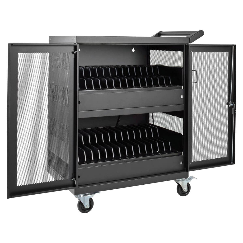 The cart promotes comprehensive device protection with steel construction and a black powder-coated finish for long-term durability. It locks with the included keys to help prevent device theft, damage or tampering, and flow-through ventilation helps prevent overheating.