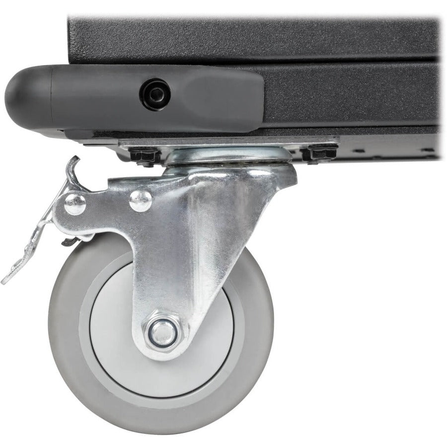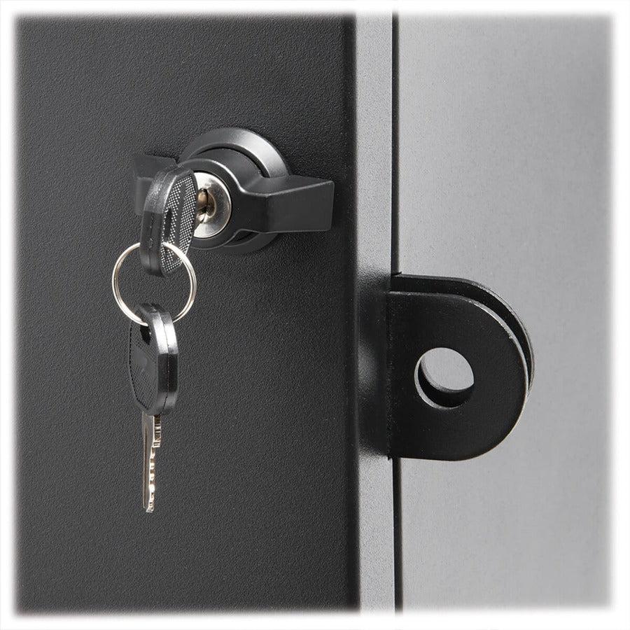 Secure Storage Cart Provides Ample Space for Laptops, Tablets and Cables Constructed from heavy-duty steel with a black powder-coated finish, this SmartRack® mobile cart provides safe, secure storage for your laptops, tablets and other valuable electronics. The front and back doors lock with the included keys to help prevent theft, damage and tampering. For extra security, the doors can be fastened with user-supplied padlocks. Flow-through vents on the doors and side panels help protect the devices against overheating, and the specially coated shelves help prevent device scratches and scuffs.