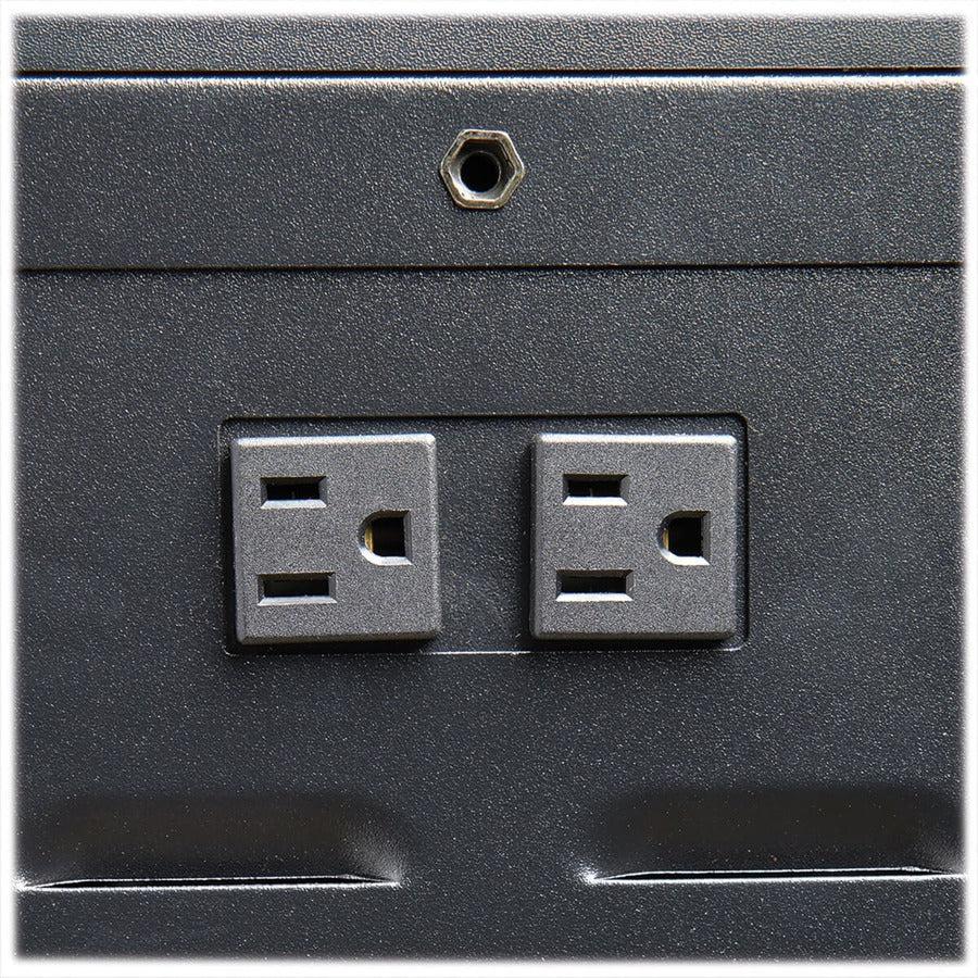 Laminated Wood-Grain Top Doubles as a Convenient Workstation The laminated top acts as a smooth writing surface and holds a projector, monitor or other peripherals. Those external devices plug into two NEMA 5-15R outlets. You can also mount a flat-screen monitor or television using Tripp Lite’s CSC36DM Display Mount Adapter Kit (sold separately). The storage cart is powered by a 10-foot cord and NEMA 5-15P plug that connects to a compatible AC outlet.
