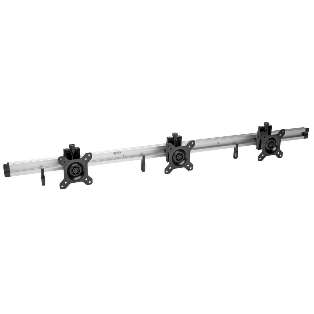 Up to three displays attach to VESA mounts that can slide closer or further apart along the rail for optimal viewing. The rail is concealed behind the displays for a sleek, professional appearance. Included cable guides attach to the rail to keep power cords out of the way.