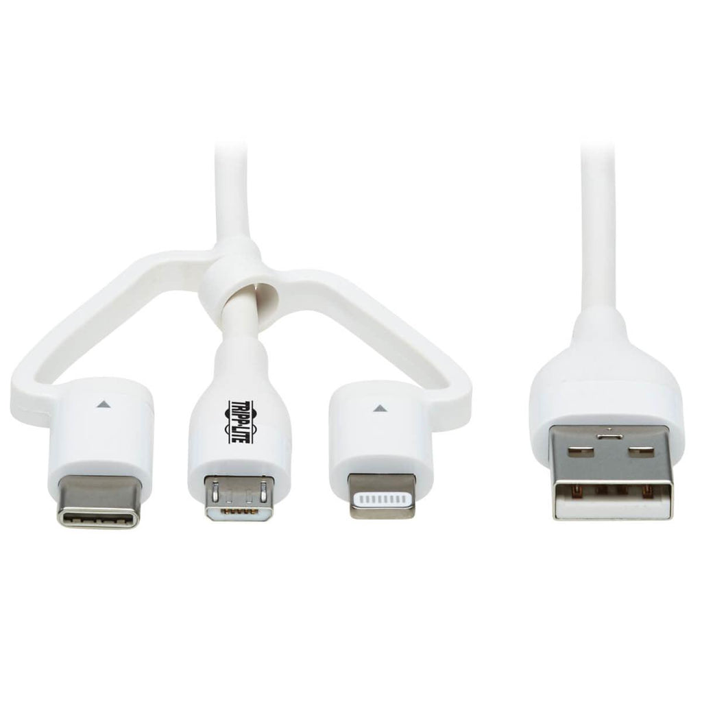 All-in-One USB Cable Charges and Syncs Your Frequently Used Mobile Devices Now you can charge and synchronize all your devices with a single cable and avoid the tangle and clutter of multiple cords. This Safe-IT™ sync/charge cable (M/3xM) features Apple Lightning, USB Micro-B and USB-C connectors on the same end, which allows you to connect almost any mobile device to your computer, laptop or wall charger’s USB-A port. Not only does the M101AB-004-LMCW charge and power your device, it simultaneously syncs and transfers photos, MP3s and other important files at USB 2.0 data transfer speeds up to 480 Mbps. The cable is backward compatible with previous USB generations, allowing you to use it with older equipment.