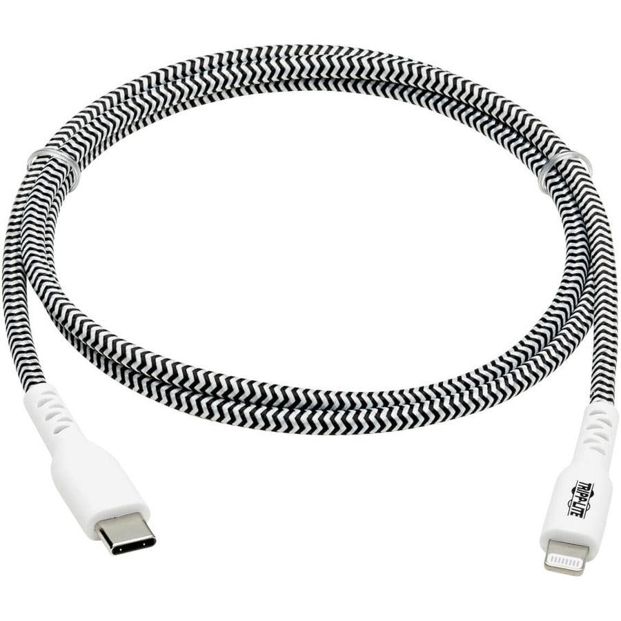 Tripp Lite M102-003-HD Heavy-Duty USB-C to Lightning Sync/Charge Cable, MFi Certified - M/M, USB 2.0, 3 ft. (0.91 m). Cable length: 0.91 m, Connector 1: Lightning, Connector 2: USB C. Input voltage: 20 V, Input current (max): 3 A. Cable diameter: 4 mm. Quantity per pack: 1 pc(s), Package width: 116.1 mm, Package depth: 59.9 mm. Master (outer) case width: 249.9 mm, Master (outer) case length: 134.9 mm, Master (outer) case height: 80 mm
