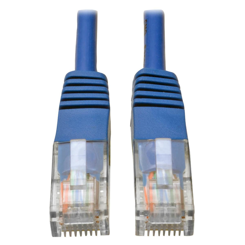 Tripp Lite's 30-ft. (9.14 m) Blue category 5e (Cat5e) patch cable has 2 standard RJ45 molded male connectors featuring integral strain relief. The cable is manufactured from PVC 4-pair Solid conductor UTP and is rated for 350MHz/1Gbps communication. All cables are offered in a variety of lengths and colors for all category 5 (Cat5) and 5e cabling needs. Snagless category 5e patch cables are also available.