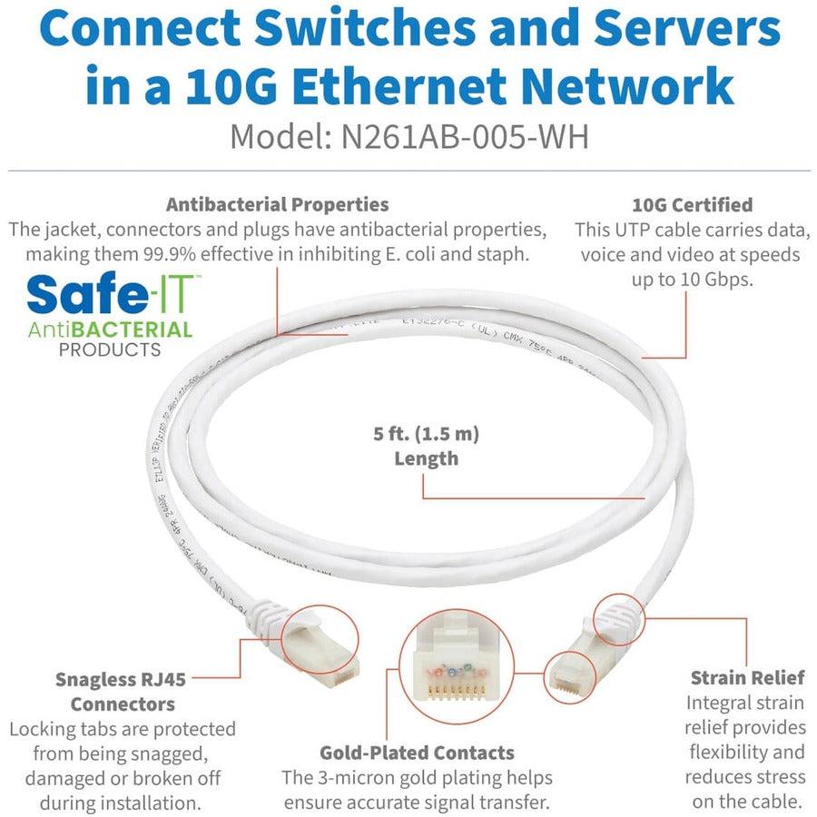 Tripp Lite N261AB-005-WH Safe-IT Cat6a 10G Certified Snagless Antibacterial UTP Ethernet Cable (RJ45 M/M), White, 5-ft. (1.52 m). Cable length: 1.52 m, Cable standard: Cat6a, Cable shielding: U/UTP (UTP), Connector 1: RJ-45, Connector 2: RJ-45, Connector contacts plating: Gold, Data transfer rate: 10000 Mbit/s