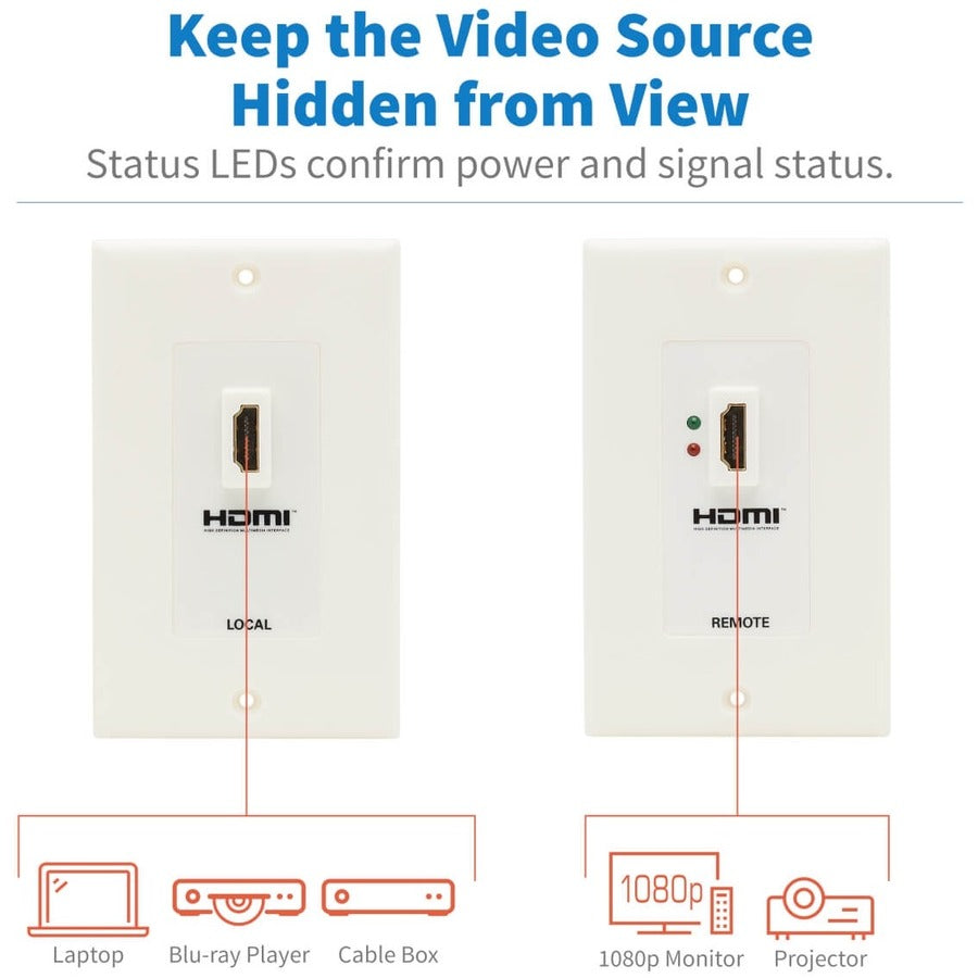 Simply run two Cat5/6 cables between the local transmitter and remote receiver wallplates, and plug in standard Tripp Lite HDMI cables to the HDMI source and the display. The Green LED on the remote receiver wallplate lets you know that power from the source and monitor. When functioning properly, only the Green LED will be lit. If the Red LED is illuminated, it means that the remote receiver is not receiving a functional signal from the source.