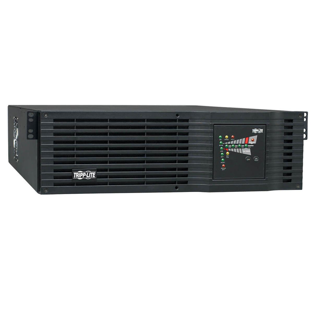 Tripp Lite Smart Online UPS systems offer high performance power protection ideal for critical server and network equipment in datacenters, computer rooms and network closets. Online, double-conversion Uninterruptible Power Supply (UPS) maintains perfectly regulated output power by continuously converting raw AC input to DC, then re-converting output back to AC. Fully regulated sine wave AC output with +/-2% voltage regulation powers network equipment continuously, even during severe brownouts and overvoltages, all without depleting UPS battery reserves. Maintains battery-derived AC output during power failures with zero transfer time. Extended runtime options available. High 98% efficient operation in optional economy mode saves BTU heat output and energy costs. Network management interfaces support communications via USB, RS-232, contact-closure and PRE-INSTALLED SNMPWEBCARD network interface. Built-in DB9 port offers both enhanced RS-232 data and basic contact closure monitoring ability. HID-compliant USB interface enables integration with built-in power management and auto shutdown features of Windows and Mac OS X. Includes PowerAlert monitoring software and complete cabling. Emergency Power Off (EPO) interface. LED display reports UPS operating mode, line power availability, battery mode operation, inverter operation and output power availability. Audible alarm with push-button momentary alarm-cancel. Programmable self-test. Battery independent restart. Fault-tolerant auto-bypass mode. Field-replaceable, hot-swappable internal batteries and external battery packs. - Tripp Lite SU3000RTXL3UN 3000VA / 3kVA / 2400W on-line, double-conversion 3U rackmount UPS - Selectable 110/120V output (120V factory preset) - NEMA L5-30P input, 4 NEMA 5-15/20R, 4 5-15R & 1 L5-30R outlets - Two switched 4-outlet load banks support remote reboot or programmable load shedding options - Supports 2% output voltage regulation and zero transfer time in double conversion mode - Economy mode option offers enhanced 98% efficiency operation, reduced power consumption and lower BTU emissions - 14 minutes runtime at 50% load (1200W) and 5 minutes at 100% load (2400W) with internal batteries - BP72V15-2U (limit 1), BP72V28RT-3U (multi-pack compatible) and BP72V18-2US (multi-pack compatible) external battery packs available (some configurations require Tripp Lite's External Battery Configuration Software) - LED Display reports UPS operating mode, line power availability, battery mode operation, inverter status and output power availability - Audible alarm with push-button momentary alarm-cancel - 4 post installation hardware included, Optional 2POSTRMKITHD enables 2 post rack installation - Single line TEL / Network surge suppression - Electronic bypass maintains utility output during a variety of UPS fault conditions - Battery independent restart ensures automatic UPS power-up without user interaction after lengthy power outages, even when batteries are expired and require replacement - Built-in USB, RS-232, contact-closure and PRE-INSTALLED SNMPWEBCARD network interface - HID-compliant USB interface enables integration with built-in power management and auto shutdown features of Windows and Mac OS X - Included PowerAlert UPS monitoring software