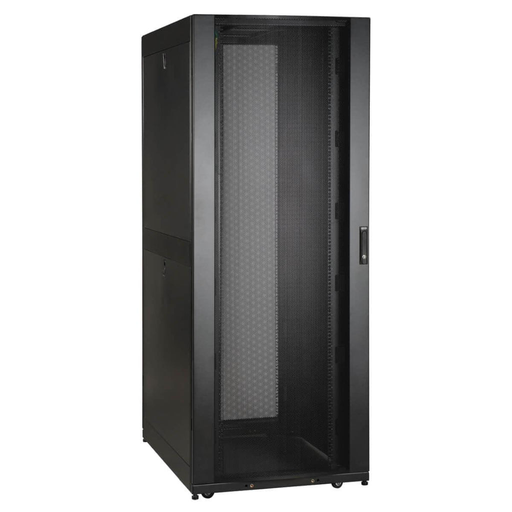 Ships fully assembled for rapid deployment and roll into place on heavy-duty pre-installed casters. Front and rear sets of equipment mounting rails adjust in 1/4" increments. Adjustment is quick and convenient. The easy-view depth index ensures consistent rail placement without requiring time-consuming measurements. Toolless accessory mounting rails (2 rails per enclosure) include slots for quick installation of compatible PDUs and vertical cable managers. Mounting slots are arranged in an industry-standard pattern compatible with a wide variety of accessories. Each rail can accommodate two vertical PDUs or cable managers side-by-side (four items per enclosure). Enclosure includes mounting hardware of 50 pieces of M6 cage nuts and 50 pieces of M6 screws Textured powder coat finish for tough resistance to environmental concerns such as deployment in warehouses. Massive front to rear ventilation capacity. 65+% open space in door perforation pattern meets or exceeds server manufacturer requirements. Maximum usable internal depth of 37 inches/94 cm (front to rear rail). Weight ratings of 3000 lbs (1360.8 kgs) stationary and 2250 lbs (1020.6 kgs) rolling. Front door is locking, reversible and removable. Rear doors are locking and reversible. Split rear door design reduces clearance requirements for service entry allowing the enclosure to be placed closer to a wall. Locking removable side panels are 'half size' to make them smaller and lighter improving ease of installation and servicing. Two side panels per side (4 panels total). Side panels are keyed alike to the front and rear doors. Built in baying tabs allow enclosures to be combined securely in rows. Center-to-center width can be set at 750mm or 30". Casters are pre-installed and support a rolling load capacity of 2250 lbs (1020.6 kgs), allowing the enclosures to be pre-configured and rolled to the final installation location. Casters are removable. Leveling feet extend to allow enclosure to be positioned on uneven floors. Levelers are removable. Compact design allows the enclosure to roll through standard height commercial doorways. Convenient grounding system. All components are grounded to the enclosure frame which includes multiple connections for facility ground. Front and rear doors include quick-release ground wires. Open bottom for cable access. Top panel has generous cable access holes. Panel can be removed toollessly in seconds without having to disconnect cables first. Included stabilizing brackets are used for shipment and can be reattached at the bottom of the enclosure frame on the inside or outside of the rack. Meets all enclosure requirements towards PCI DSS (Payment Card Industry Data Security Standard) Compliance Compatibility with airflow optimization accessories as well as cable management accessories.