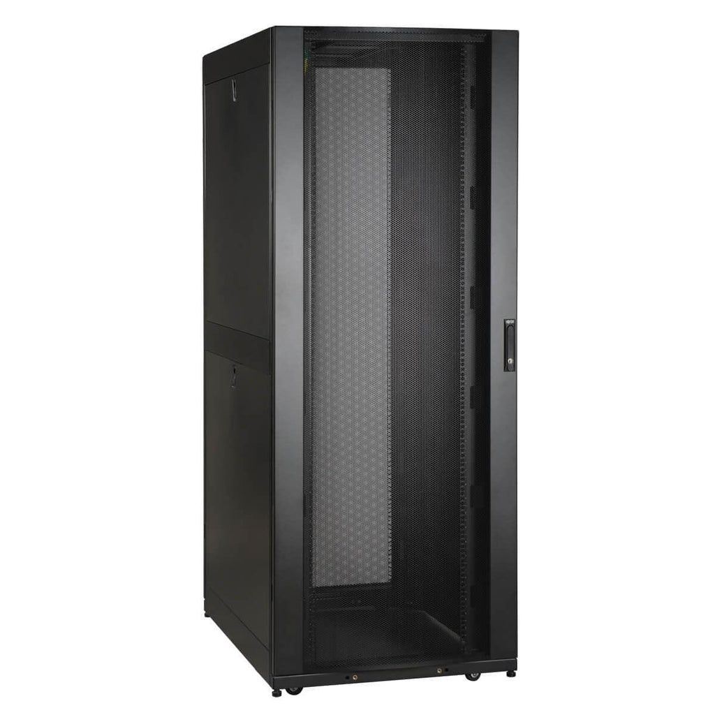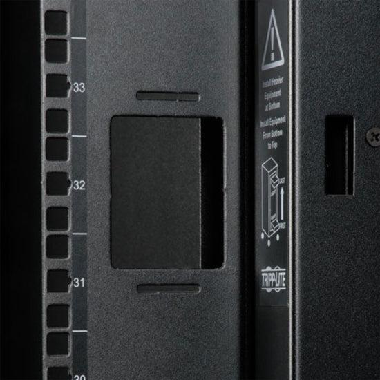 Front and rear sets of equipment mounting rails adjust in 1/4" increments. Adjustment is quick and convenient. The easy-view depth index ensures consistent rail placement without requiring time-consuming measurements. Toolless accessory mounting rails (2 rails per enclosure) include slots for quick installation of compatible PDUs and vertical cable managers. Mounting slots are arranged in an industry-standard pattern compatible with a wide variety of accessories. Each rail can accommodate two vertical PDUs or cable managers side-by-side (four items per enclosure). Enclosure includes mounting hardware of 50 pieces of M6 cage nuts and 50 pieces of M6 screws Textured powder coat finish for tough resistance to environmental concerns such as deployment in warehouses. Massive front to rear ventilation capacity. 65+% open space in door perforation pattern meets or exceeds server manufacturer requirements. Maximum usable internal depth of 37 inches/94 cm (front to rear rail). Weight ratings of 3000 lbs (1360.8 kgs) stationary and 2250 lbs (1020.6 kgs) rolling. Front door is locking, reversible and removable. Rear doors are locking and reversible. Split rear door design reduces clearance requirements for service entry allowing the enclosure to be placed closer to a wall. Locking removable side panels are 'half size' to make them smaller and lighter improving ease of installation and servicing. Two side panels per side (4 panels total). Side panels are keyed alike to the front and rear doors. Built in baying tabs allow enclosures to be combined securely in rows. Center-to-center width can be set at 750mm or 30". Leveling feet extend to allow enclosure to be positioned on uneven floors. Levelers are removable. Convenient grounding system. All components are grounded to the enclosure frame which includes multiple connections for facility ground. Front and rear doors include quick-release ground wires. Open bottom for cable access. Top panel has generous cable access holes. Panel can be removed toollessly in seconds without having to disconnect cables first. Included stabilizing brackets are used for shipment and can be reattached at the bottom of the enclosure frame on the inside or outside of the rack. Meets all enclosure requirements towards PCI DSS (Payment Card Industry Data Security Standard) Compliance Compatibility with airflow optimization accessories as well as cable management accessories.