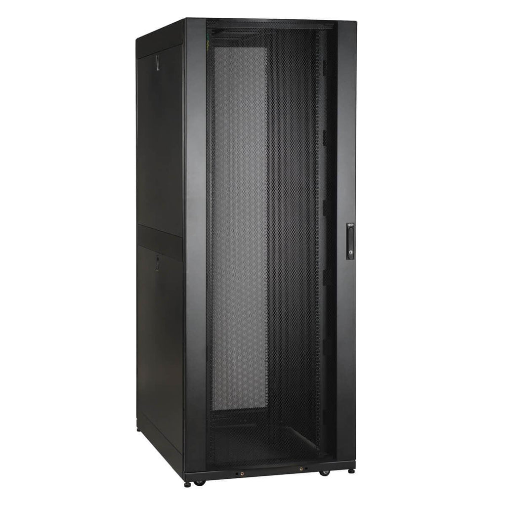 Comes with the two pre-installed SRCABLEVRT3 (6-ft. (1.83 m) vertical cable manager with 3" width) to help eliminate cable stress inside the enclosure Front and rear sets of equipment mounting rails adjust in 1/4" increments. Adjustment is quick and convenient. The easy-view depth index ensures consistent rail placement without requiring time-consuming measurements. Toolless accessory mounting rails (2 rails per enclosure) include slots for quick installation of compatible PDUs and vertical cable managers. Mounting slots are arranged in an industry-standard pattern compatible with a wide variety of accessories. Each rail can accommodate two vertical PDUs or cable managers side-by-side (four items per enclosure). Enclosure includes mounting hardware of 50 pieces of M6 cage nuts and 50 pieces of M6 screws. Textured powder coat finish for tough resistance to environmental concerns such as deployment in warehouses. Massive front to rear ventilation capacity. 65+% open space in door perforation pattern meets or exceeds server manufacturer requirements. Maximum usable internal depth of 37 inches/940 mm (front to rear rail). Front door is locking, reversible and removable. Rear doors are locking and reversible. Split rear door design reduces clearance requirements for service entry allowing the enclosure to be placed closer to a wall. Locking removable side panels are 'half size' to make them smaller and lighter improving ease of installation and servicing. Two side panels per side (4 panels total). Side panels are keyed alike to the front and rear doors. Built in baying tabs allow enclosures to be combined securely in rows. Center-to-center width can be set at 750mm or 30" to match standard data center floor tiles. SmartRack Enclosure supports up to 3000 lbs (1360.8 kgs) of equipment stationary and 2250 lbs (1020.6 kgs) rolling. Ships fully assembled for rapid deployment and roll into place on heavy-duty pre-installed casters (casters are removable) Leveling feet extend to allow enclosure to be positioned on uneven floors. Levelers are removable. Convenient grounding system. All components are grounded to the enclosure frame which includes multiple connections for facility ground. Front and rear doors include quick-release ground wires. Open bottom for cable access. Top panel has generous cable access holes. Panel can be removed toollessly in seconds without having to disconnect cables first. Included stabilizing brackets are used for shipment and can be reattached at the bottom of the enclosure frame on the inside or outside of the rack. Meets all enclosure requirements towards PCI DSS (Payment Card Industry Data Security Standard) Compliance Compatibility with airflow optimization accessories as well as cable management accessories.