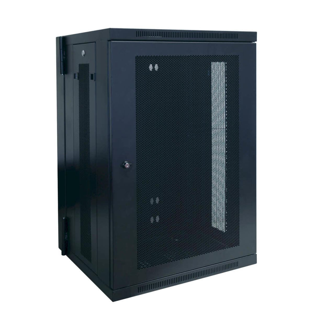 The SRW18US SmartRack 18U Low-Profile Switch-Depth Wall-Mount Rack Enclosure Cabinet is designed to house EIA-standard 19-inch rack equipment in network wiring closets, retail locations, classrooms, back offices and other areas with limited floor space where you need equipment to be secure, organized and out of the way. Constructed from heavy-duty steel with a durable black powder-coated finish, the cabinet has a maximum load capacity of 250 lbs (113.4 kgs).
