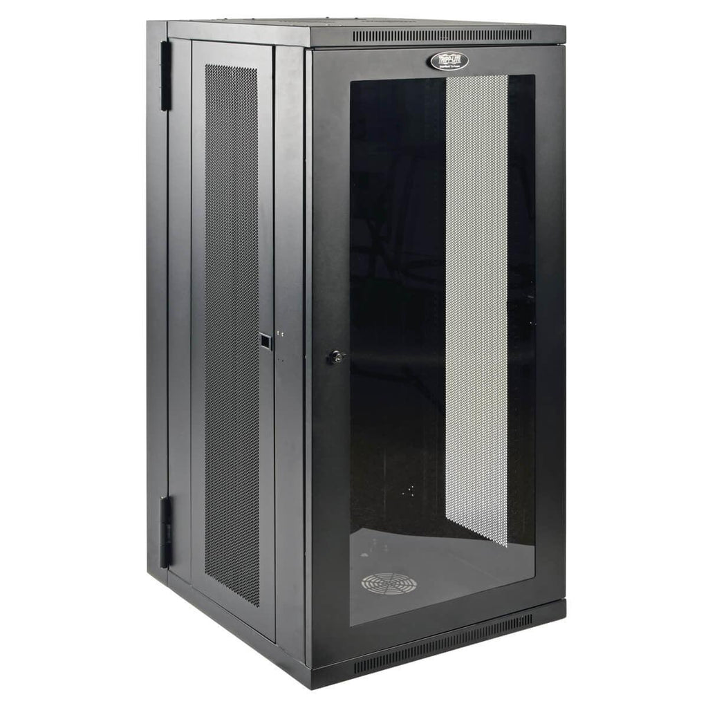 The SRW26USG SmartRack 26U Low-Profile Switch-Depth Wall-Mount Rack Enclosure Cabinet is designed to house EIA-standard 19-inch rack equipment in network wiring closets, retail locations, classrooms, back offices and other areas with limited floor space where you need equipment to be secure, organized and out of the way. Constructed from heavy-duty steel with a durable black powder-coated finish, the cabinet has a maximum load capacity of 250 lbs (113.4 kgs).
