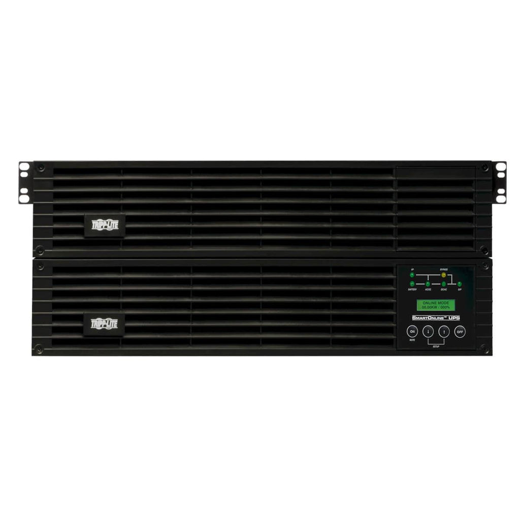 Tripp Lite SU6000RT4UHVG 6000VA / 6kVA / 5400 watt on-line, double-conversion UPS system in a single 4U rack/tower compatible housing (output is limited to 4992 watts when used at 208V with L6-30P input plug) Full-time active power conditioning maintains clean, continuous dual-conversion AC output free of voltage fluctuations, power interruptions and line noise Fault tolerant electronic bypass maintains utility output during a variety of UPS fault conditions Detachable back panel PDU contains hardwire input line cord connection, output receptacles and manual bypass switch to support hot-swappable whole UPS replacement with no interruption to connected equipment Hardwire input and 4 C19 output receptacles Included rail kit supports 4U 19 inch rackmount installation in 4 post racks Optional 2POSTRMKITHD supports installation in 2 post 19 inch racks (1 required for SU6000RT4UHVG) Optional 2-9USTAND supports upright tower placement (1 required for SU6000RT4UHVG) Maximum installed rack depth of only 20.7 in. / 52.6cm Maintains full-time sine wave output within 2% of selected 200/208/220/230/240V nominal in double conversion mode Corrects brownouts to 156V at full load (100V at 50% load or less) Corrects overvoltages to 290V at full load (300V at 90% load or less) Supports 50/60Hz operation for worldwide frequency compatibility Double-conversion operation offers full-time AC to DC, then DC to AC conversion to maintain perfectly regulated sine wave AC output with enhanced protection from harmonic distortion, fast electrical impulses and other hard-to-solve power problems not addressed by other UPS types High efficiency ECONOMY MODE operation significantly reduces BTU heat output and operating energy costs Network-grade AC surge and noise suppression Supports detailed monitoring of equipment load levels, self-test data and utility power conditions via built-in RS-232, USB and network management card options Compatible with Tripp Lite UPS management card options TLNETCARD, WEBCARDLX, SNMPWEBCARD, MODBUSCARD and RELAYIOCARD Optional WEBCARDLX (sold separately) with the latest version of PowerAlert Device Manager firmware (PADM20) provides enhanced remote management capabilities PADM20 and PowerAlert Element Manager (PAEM) form a powerful tool for expanding maintenance functions in large installations, including firmware update checks and backup and restoration of device configurations Optional RELAYIOMINI interface module offers three configurable hard contact closure outputs for custom event notification (requires removal of USB interface module) HID-compliant USB interface enables integration with built-in power management and auto shutdown features of Windows and Mac OS X USB & Serial ports enable data-saving unattended shutdown when used with Tripp Lite's PowerAlert software, available via FREE download from www.tripplite.com/poweralert Front panel LEDs and LCD readout with scroll controls support front-panel visual monitoring of all major UPS functions with support for a variety of control options to support advanced UPS settings and configurations LED/LCD display panel rotates for viewing in rackmount or tower configurations Supports Emergency Power Off (EPO) via built-in interface Battery independent restart ensures automatic UPS power-up without user interaction after lengthy power outages, even when batteries are expired and require replacement BP192V12-3U external battery packs are field replaceable and hot swappable Intelligent battery management system with temperature-compensated charging extends battery life Some external battery configurations require the use of Tripp Lite's External Battery Configuration Software (see manual) Frequency conversion mode enables conversion of 60Hz to 50Hz or 50Hz to 60Hz (no de-rating)