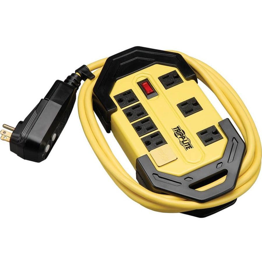 This Tripp Lite power strip is designed to safely distribute power to connected equipment in harsh environments. It provides a convenient source for multiple outlets wherever they're needed. 8 outlets distribute AC power to a wide range of power tools, pumps, machinery, air compressors and more. Convenient transformer outlets accommodate multiple transformers without blocking other outlets. A 25 ft. grounded cord with integrated cord clip reaches distant outlets. A GFCI plug protects users from electrical shock in wet or humid environments. A lighted on/off switch provides power control over connected equipment. 4 safety covers shield unused outlets from debris and accidental contact. A rugged metal case stands up to the harshest environments. Built-in cord wrap with hang holes provides convenient cord management. Integrated keyhole slots on bottom panel provide convenient wall/desk mounting. Lifetime limited warranty. Its bright yellow color alerts you and others that power cords and tools are in use.