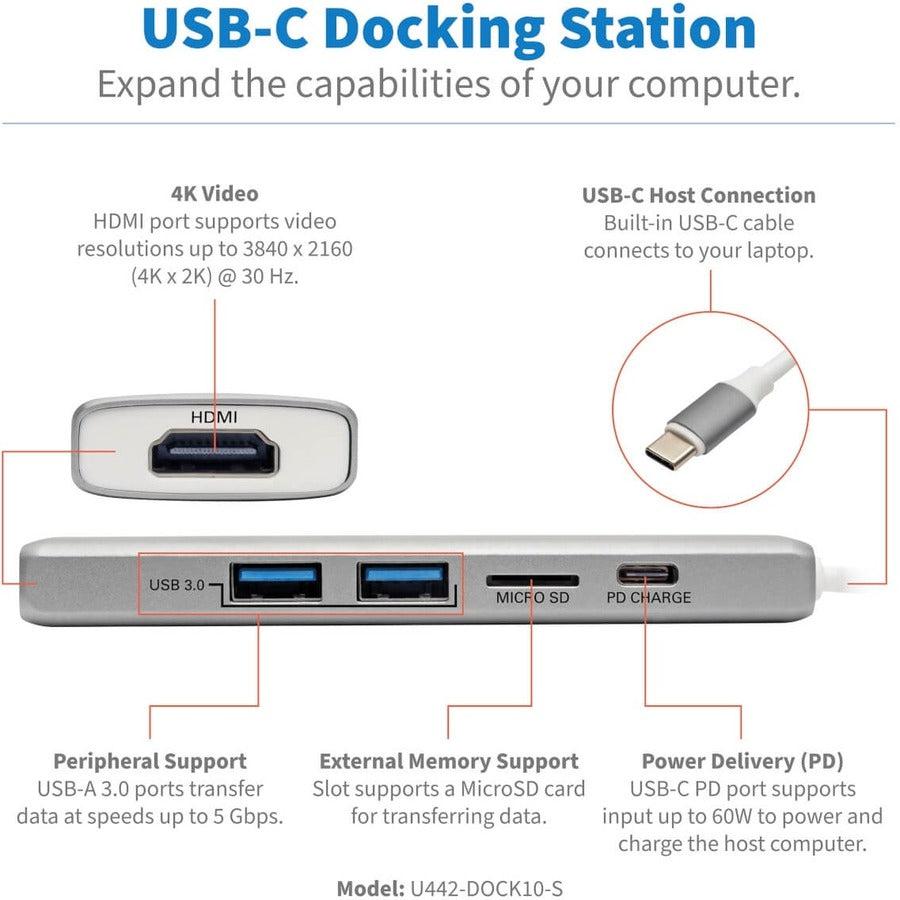 Tripp Lite U442-DOCK10-S USB-C Dock - 4K HDMI, USB 3.2 Gen 1, USB-A Hub Ports, Memory Card, 60W PD Charging. Host interface: USB 3.2 Gen 2 (3.1 Gen 2) Type-C, Hub interfaces: HDMI,RJ-45, Maximum resolution (HDMI): 3840 x 2160 pixels. Data transfer rate: 1000 Mbit/s, Product colour: Silver, Housing material: Polyvinyl chloride (PVC). Ethernet interface type: Gigabit Ethernet, Networking standards: IEEE 802.3. Power source type: USB, Power consumption (typical): 45 W. Package width: 144.8 mm, Package depth: 81.3 mm, Package height: 20.3 mm