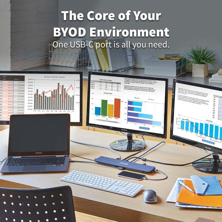 USB-C Docking Station Turns Your Device’s USB-C or Thunderbolt 3 Port into 14 New Ports This universal USB-C dock with PD Charging expands the potential of your Windows laptop, Chromebook, smartphone or PC’s USB-C or Thunderbolt 3 port. Connect the dock using the included USB-C cable, and add 14 ports to your device: 4K HDMI 4K DisplayPort 1080p VGA RJ45 Gigabit Ethernet (2) USB 2.0 (2) USB 3.0 USB 3.0 with BC 1.2 USB-C PD Charging USB-C data 3.5 mm mini stereo SD and Micro SD card slots