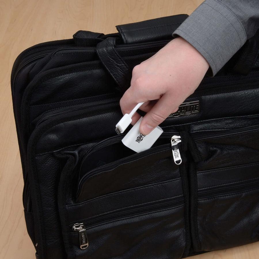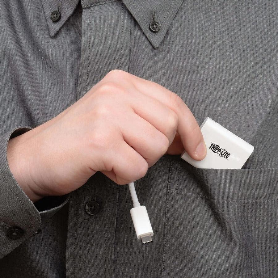 Ready to Use Right from the Package, So You Can Plug and Play Immediately The plug-and-play USB Type-C to VGA cable requires no software or drivers to download and install. Just connect the USB-C male plug to the USB-C or Thunderbolt 3 port on a source device that supports USB DisplayPort Alternate Mode. Then, connect the VGA female port to the monitor using a VGA cable (such as Tripp Lite’s P502-Series). The six-inch USB Type-C to VGA adapter fits into your laptop bag, purse or briefcase for connecting to VGA displays anywhere.