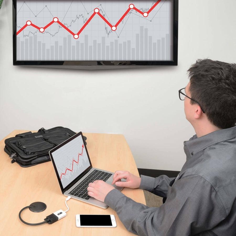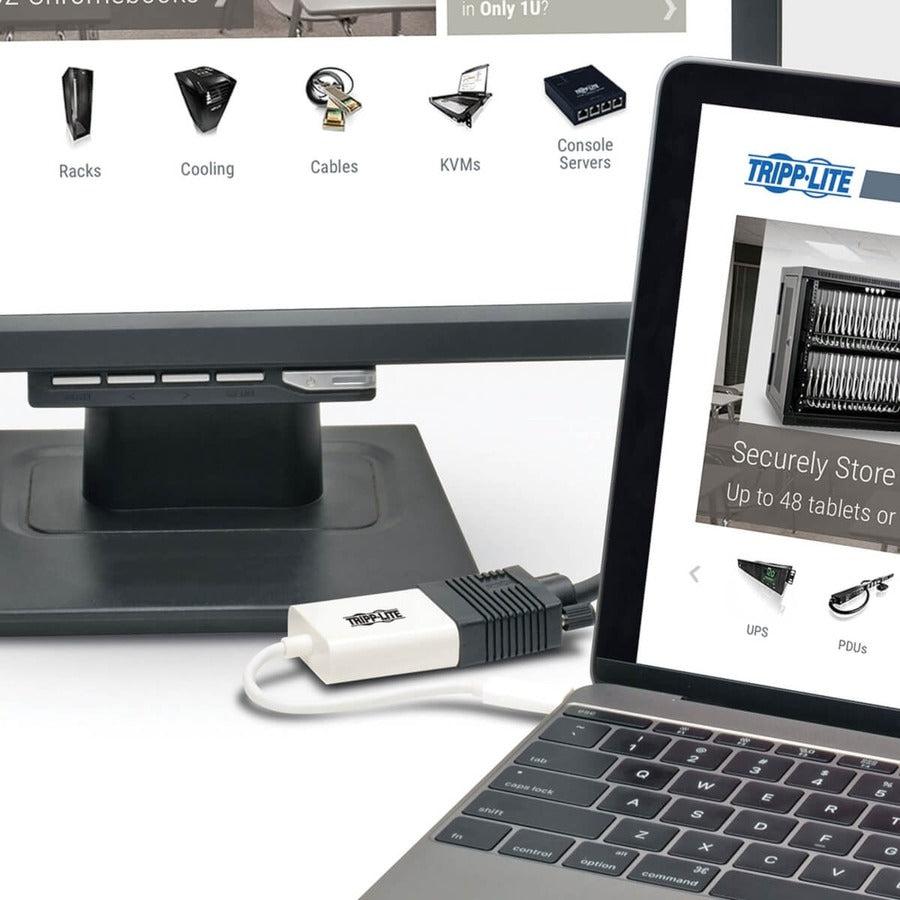 USB-C to VGA Adapter Connects to Your Laptop or Tablet’s USB-C or Thunderbolt 3 Port This USB Type-C to VGA adapter connects a VGA monitor to the USB-C or Thunderbolt 3 port on your computer, tablet, laptop, notebook, MacBook, Chromebook, Ultrabook or smartphone. It’s an ideal connector for multitasking, presenting video at trade shows and conferences, editing documents, playing online games and watching movies on a larger screen. It saves you money by allowing you to use your existing VGA display instead of buying a new monitor.