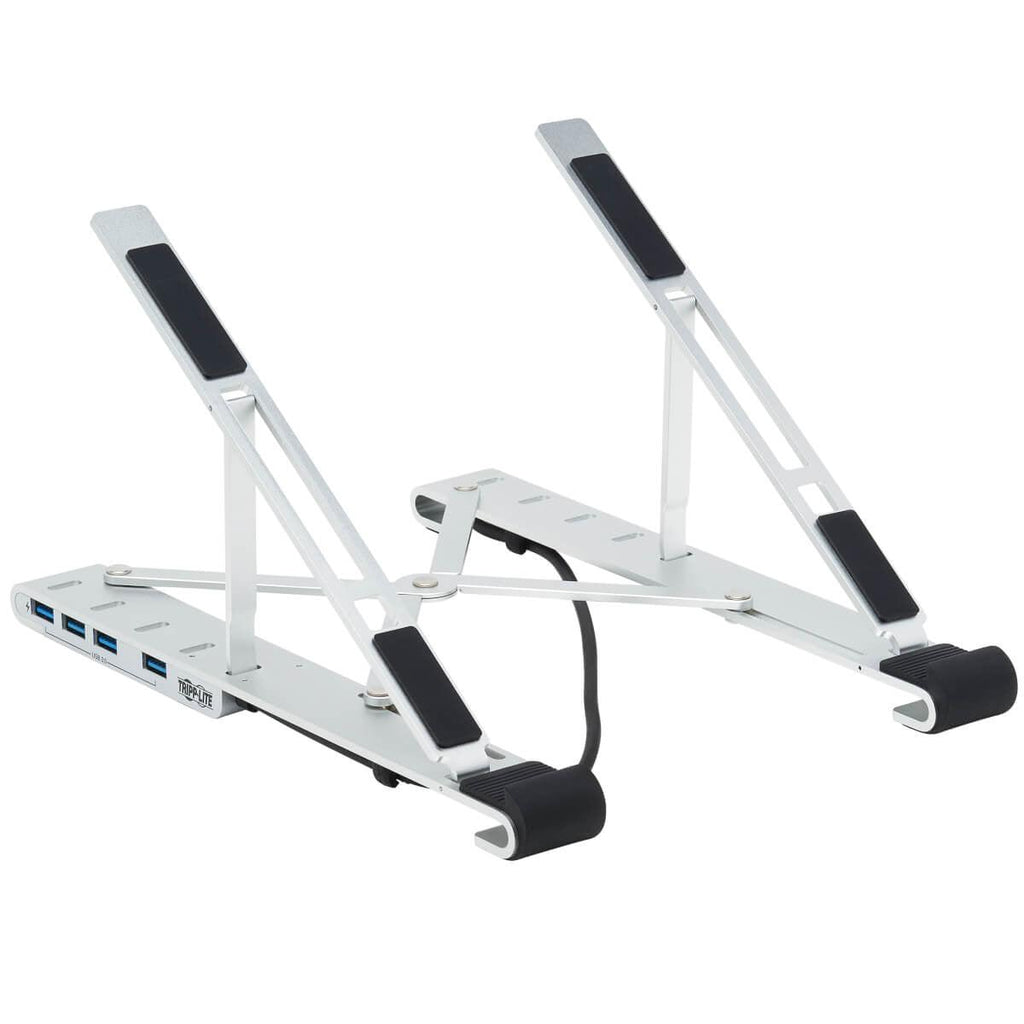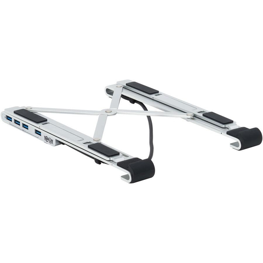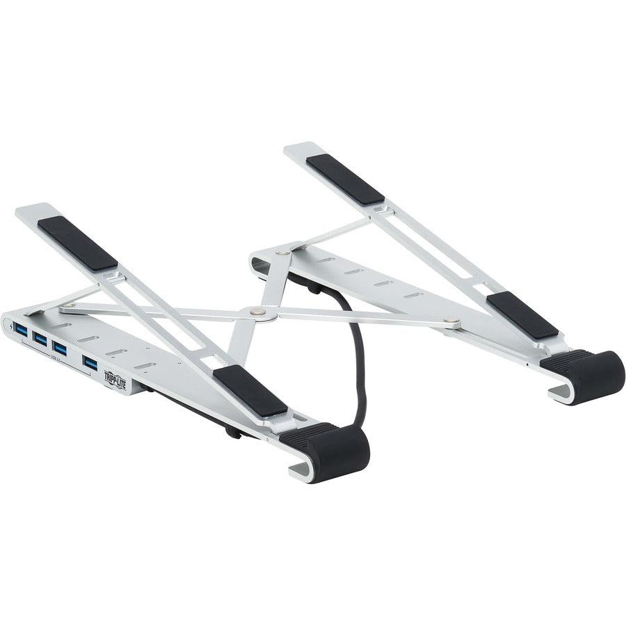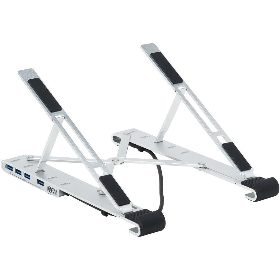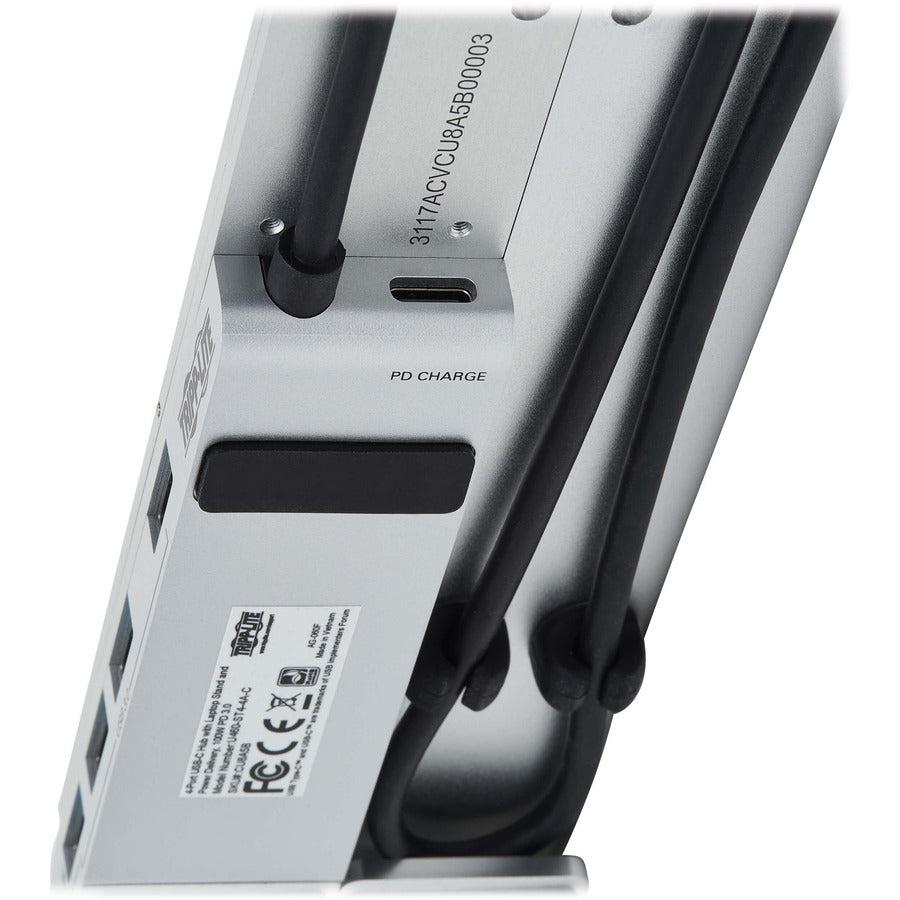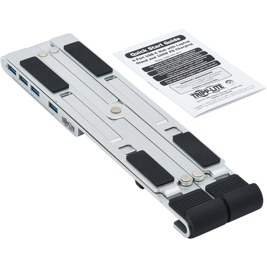 Tripp Lite U460-ST4-4A-C 4-Port USB-C Hub with Laptop Stand - USB 3.2 Gen 1, 4 USB-A Ports, Thunderbolt 3, 100W PD Charging, Silver. Product type: Notebook stand, Product colour: Black, Silver, Material: ABS synthetics. Certification: FCC. Sustainability certificates: CE, REACH, RoHS. Weight: 290 g. Package type: Box, Package width: 265 mm, Package depth: 70 mm