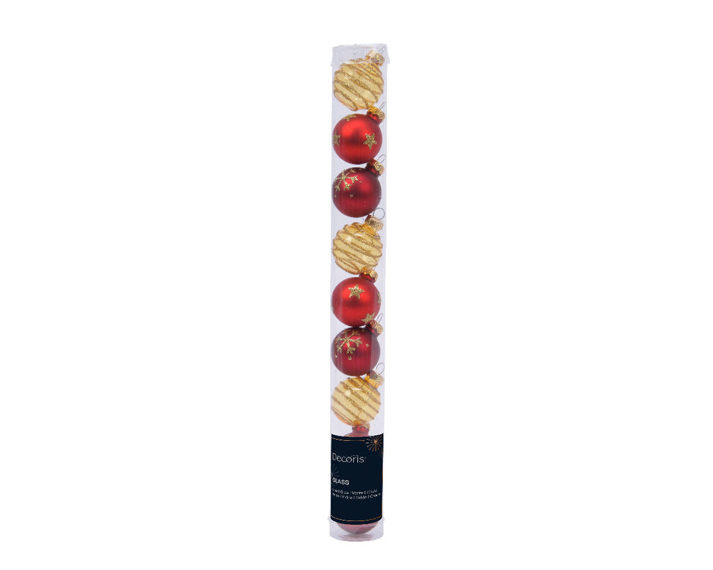 Deck your halls with the captivating beauty of the Decoris Christmas Baubles! This delightful set features six glass ornaments, each measuring about 1.2 inches, combining a stunning palette of vibrant reds and luxurious golds. The assortment includes glossy red spheres adorned with glittering stars and snowflakes, along with eye-catching striped design baubles that add a chic touch to your holiday decor.