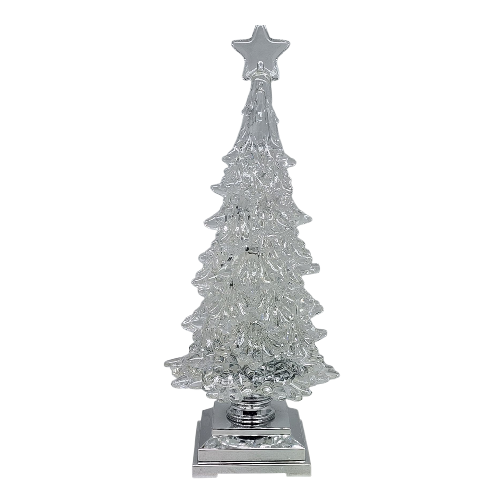 Introducing the Glistening Holiday Tree a stunning centerpiece that stands at 12.5 inches tall and spins gracefully filling the room with a mesmerizing water and light show. This enchanting tree casts a warm radiant glow that reflects off its beautifully faceted surface making any holiday gathering feel magical. Powered by 3 AA batteries this sparkling ornament will be the highlight of your seasonal decor whether displayed on a table window sill or shelf to charm guests and create a festive atmosphere.