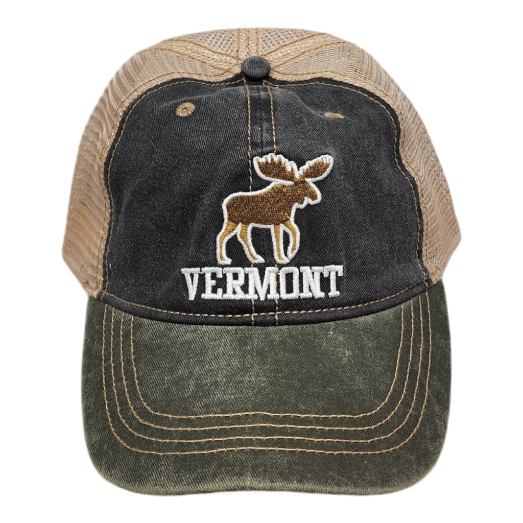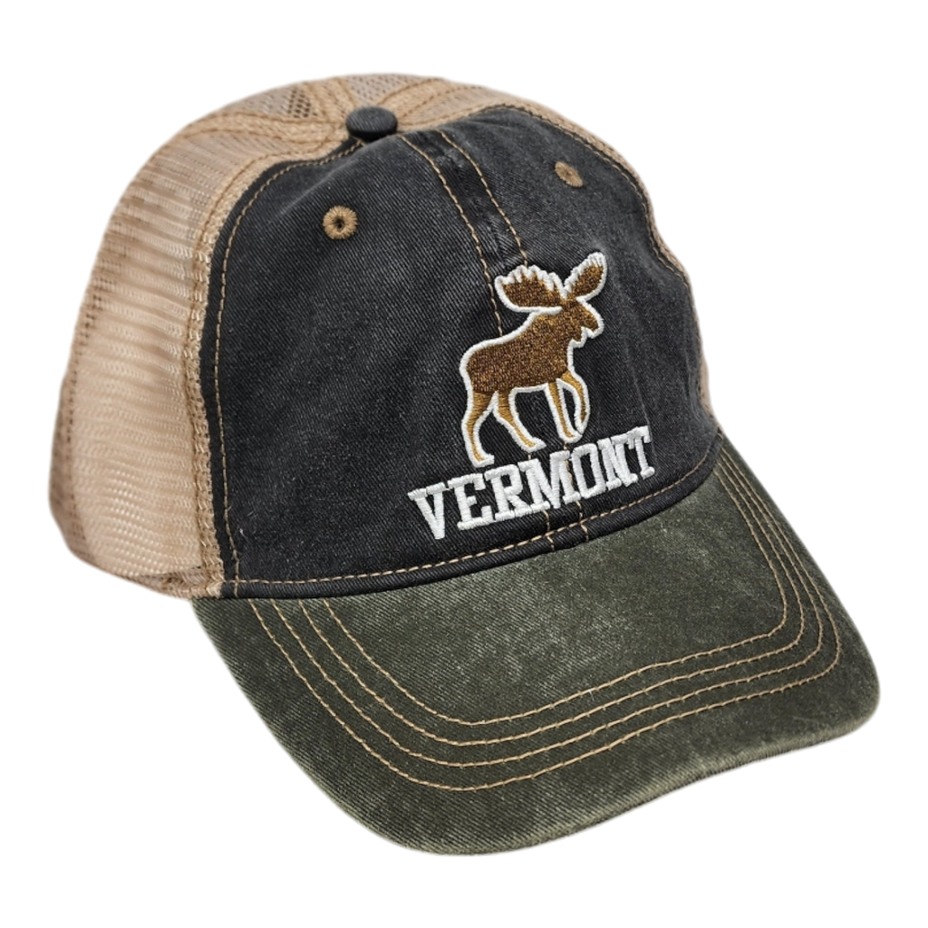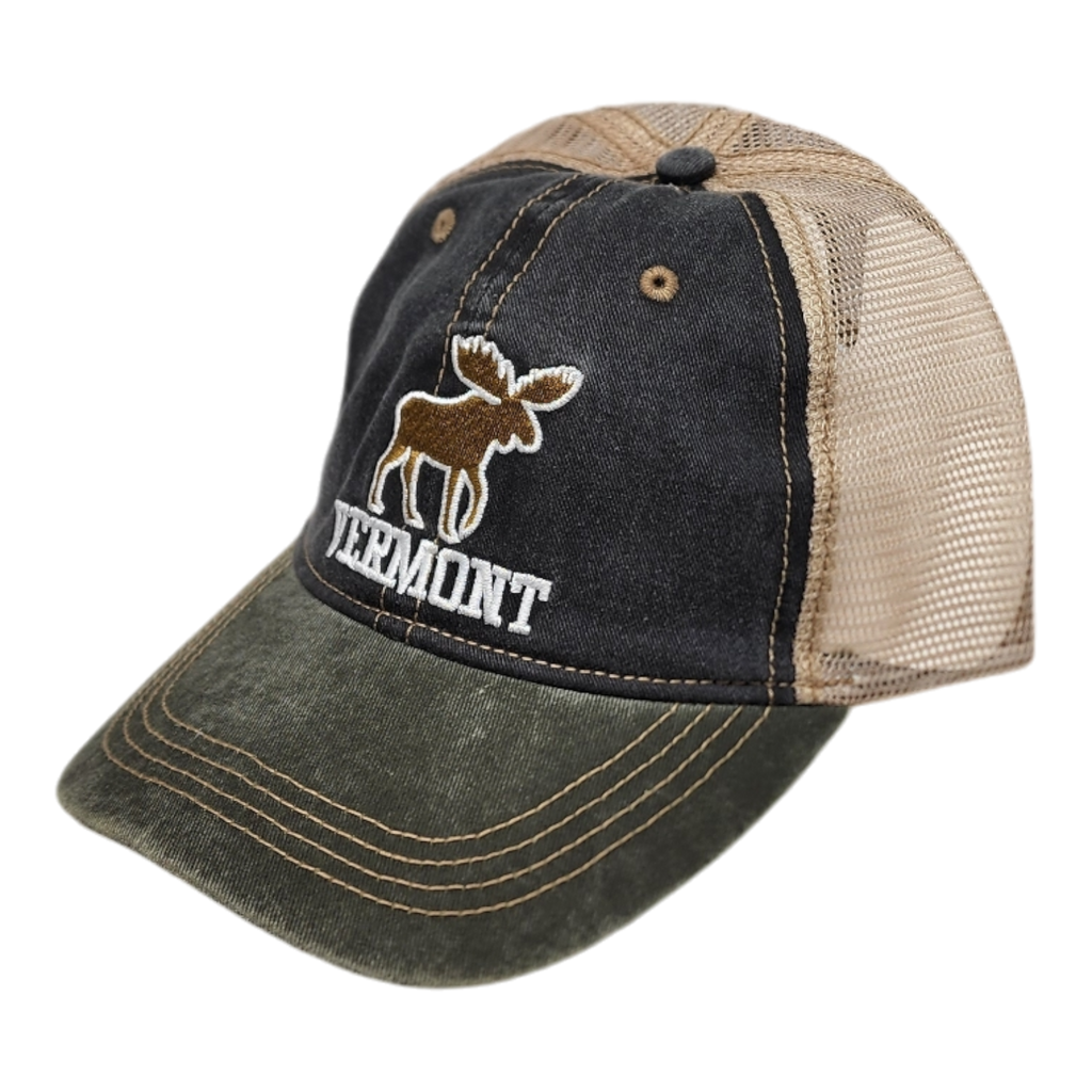 Browse the Complete Gifts & Holiday Collection Embrace the spirit of the Green Mountain State with this stylish Vermont Cap! This trucker-style hat features a rugged design with a vintage-inspired front panel and a breathable mesh back, perfect for outdoor adventures or casual day wear. The front proudly displays an embroidered moose, symbolizing the state's rich wildlife, along with the bold "Vermont" text to show off your love for this scenic state.