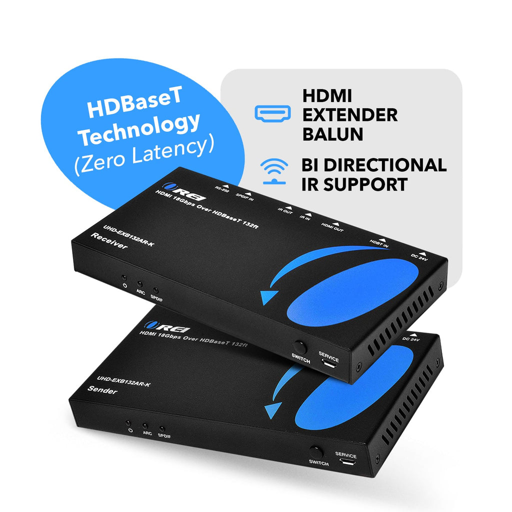 The UHD-EXB132AR-K is an HDMI extender with audio extraction, that can extend HDMI media signals up to 165 feet. It supports video resolutions up to 4K@60Hz 4:4:4. It is HDMI 2.0 and HDCP 2.2 compliant, with a video bandwidth of 18Gbps, and support for HDR and Dolby Vision. This device can extract audio from the source or an ARC/eARC TV connected to the receiver unit, providing audio output through L/R and optical ports. Additionally, the device offers bi-directional IR functionality, RS-232, and CEC pass-through. With bi-directional Power over Cable technology, the setup requires only one power adapter, which can be connected to the transmitter or the receiver. Perfect for both residential and commercial setups.
