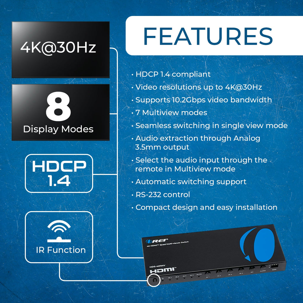 Ultra HD 4K Quad Multi Viewer 4x1 HDMI Switch VGA Output (HDS-401MV)