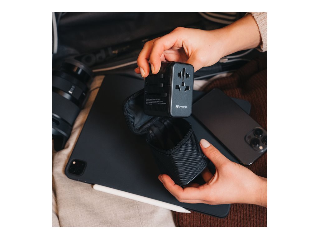 The Verbatim GaN III Universal Travel Adapter is a compact and versatile solution for travelers. This adapter supports over 180 countries, offering EU, UK, US, Australia, and China plug options. Utilizing advanced GaN III technology, it's more efficient and compact. This 5-in-1 adapter allows simultaneous charging of five devices through AC and USB ports, including two (2) USB-C with Power Delivery 3.0 (with PPS support), Quick Charge 4+ output, up to 65W each, and USB-A port supports Quick Charge 3.0 output, up to 60W. The other USB-A port has a regular output of up to 5W. Ideal for international travel, this adapter gives you 100% peace of mind wherever you may go. Verbatim's GaN III Universal Travel Adapter comes with a 2-year Limited Lifetime warranty.