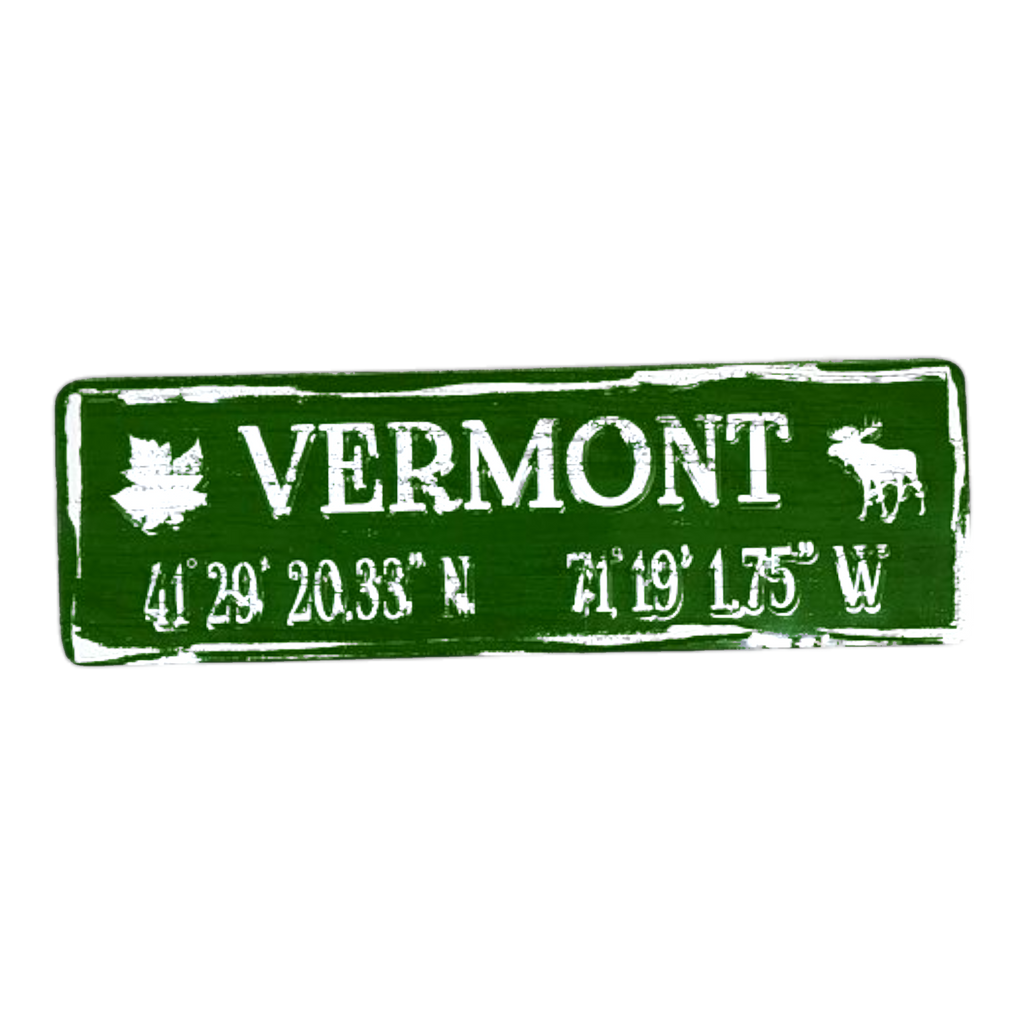 Celebrate the rugged beauty of Vermont with our stylish stamped metal magnet, designed to resemble a weathered sign and measuring 4 inches by 1.25 inches. This unique piece features the state name "Vermont," alongside its coordinates, beautifully showcasing the essence of this incredible state. The rustic green finish adds a touch of vintage charm, making it a fantastic accent for your refrigerator, workshop, or any metallic surface in your home.