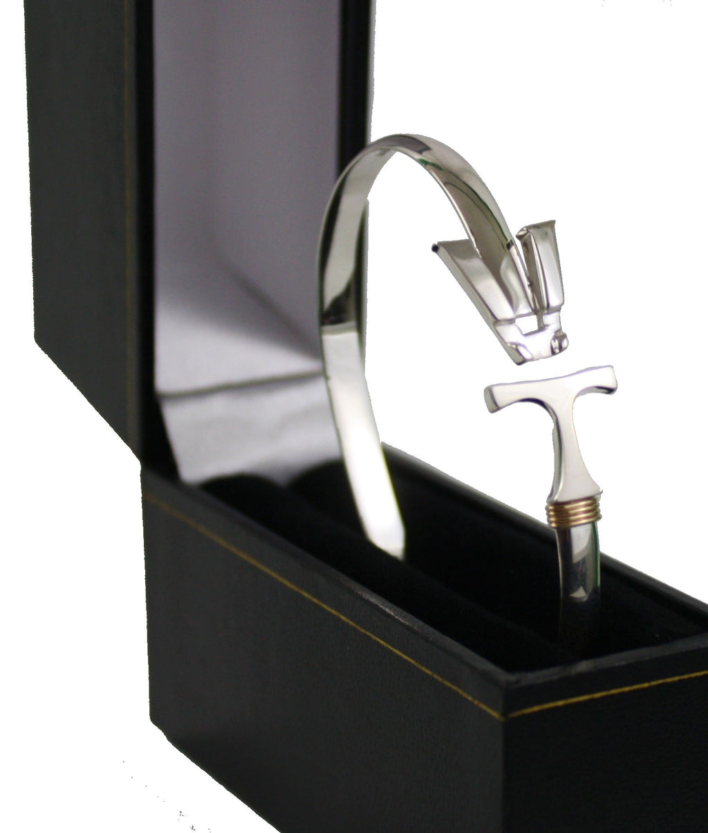 - Bracelet dimensions: 5mm wide solid sterling silver band featuring four elegant 14K gold wraps.