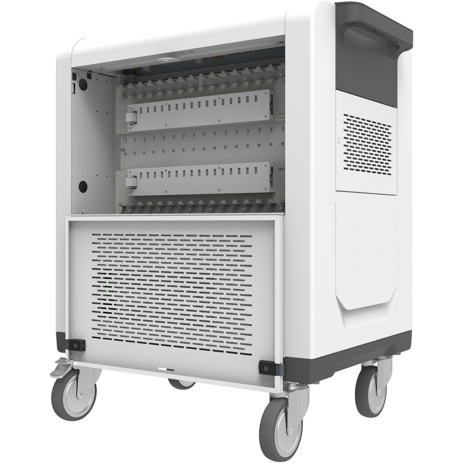 Rocstor's innovative cart design and engineering provide the charging system for easy setup, and secure day to day usage. The rear compartment of Volt SC32 is organized with two banks of 16 outlets, each with 16 cable channels, keeping the cables and power adapters well organized and structured.