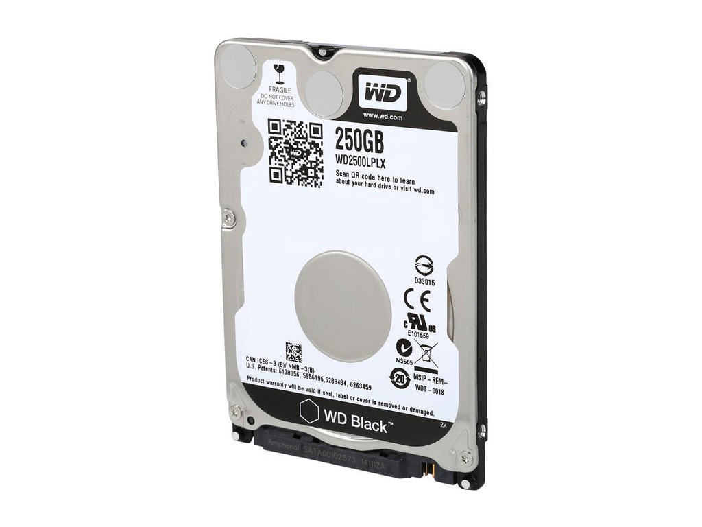 WD BLACK mobile hard drive for gaming laptops. 250GB SATA 6Gb/s performance storage with CMR technology and dual processor optimization.