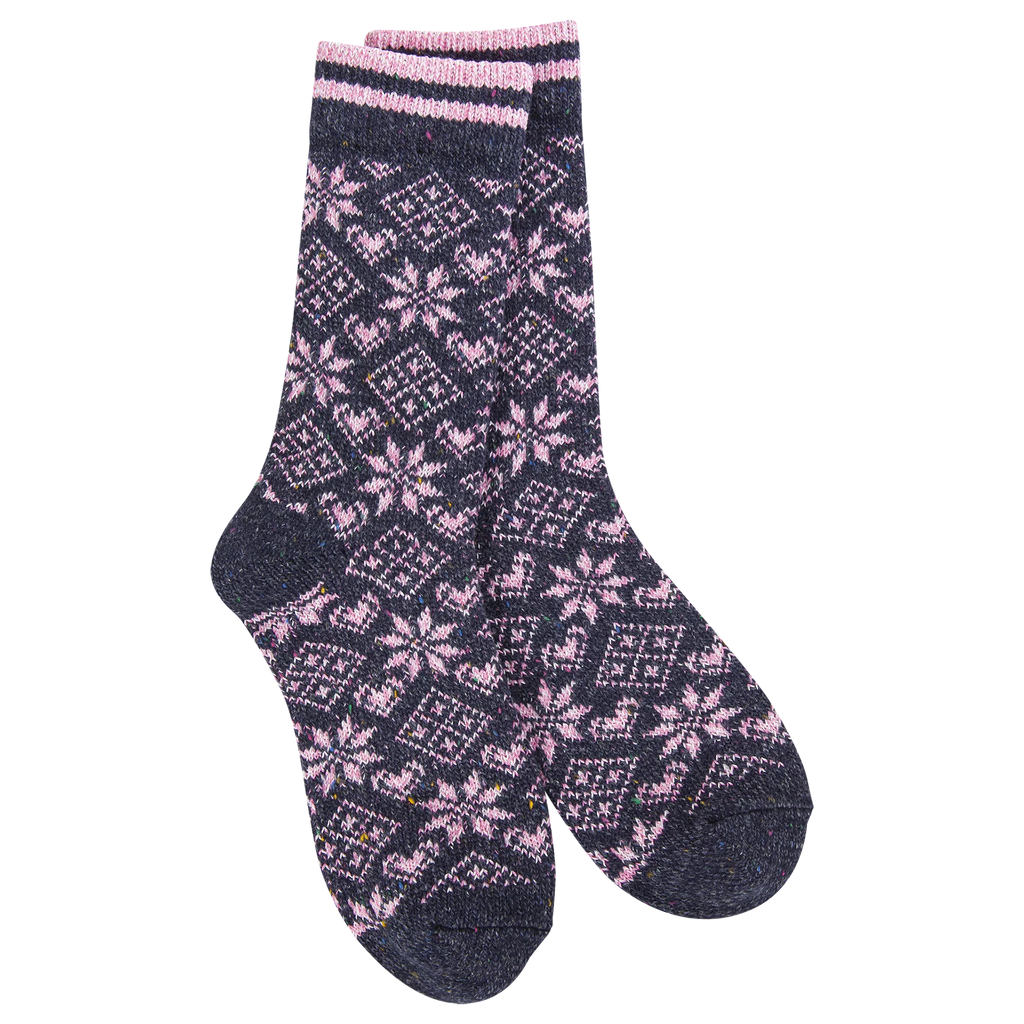 Cozy up this season with the Weekend Holiday Confetti Crew Socks in Diamond Denim! These stylish socks showcase a beautiful navy base adorned with pink floral and diamond patterns, creating a festive yet elegant look perfect for the winter months. Crafted from soft materials, they offer exceptional warmth and comfort, making them ideal for chilly days.