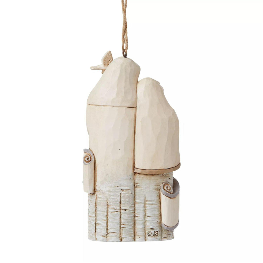 Handcrafted in incredible detail, this Holy Family ornament beautifully tells the story at the heart of Christmas. This is an elegant White Woodland design from the artistry of Jim Shore.
