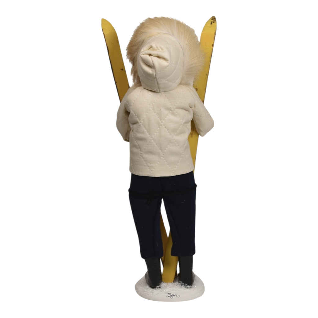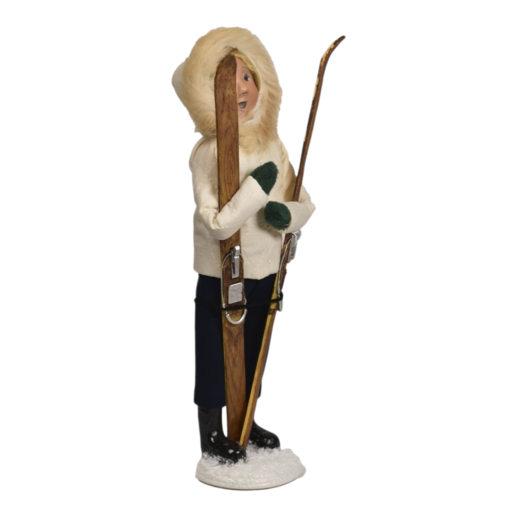 Embrace the thrill of winter adventure with the enchanting Winter Sports Family - Skiing Woman figurine! Standing at a charming 13 inches tall, this delightful Byers’ Choice collectible embodies the spirit of snowy mountain fun. Dressed in a cozy ivory winter jacket adorned with a fabulous fur hood, she radiates warmth and excitement as she proudly holds her skis. With a big smile and a ready-to-ski attitude, this figurine captures the joy of hitting the slopes during the winter months.